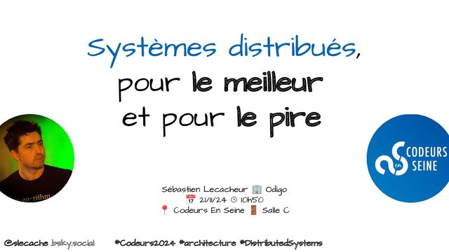 Au travers d'un retour d'expérience de nombreuses années, nous explorons donc ensemble le monde des systèmes distribués afin de comprendre pourquoi mettre en place un système distribué. Découvrons également les difficultés auxquelles il faut se préparer et comment s'en prémunir ou, tout du moins, les mitiger.