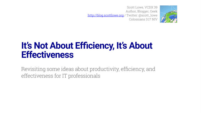 @scott_lowe Colossians 3:17 NIV It’s Not About Ef ciency, It’s About Effectiveness Revisiting some ideas about productivity, ef ciency, and effectiveness for IT professionals