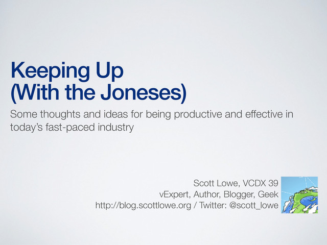being productive and effective in today’s fast-paced industry Scott Lowe, VCDX 39 vExpert, Author, Blogger, Geek http://blog.scottlowe.org / Twitter: @scott_lowe