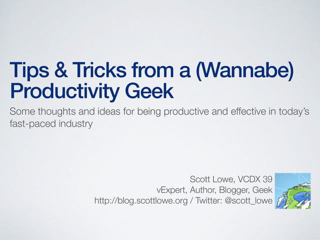and ideas for being productive and effective in today’s fast-paced industry Scott Lowe, VCDX 39 vExpert, Author, Blogger, Geek http://blog.scottlowe.org / Twitter: @scott_lowe