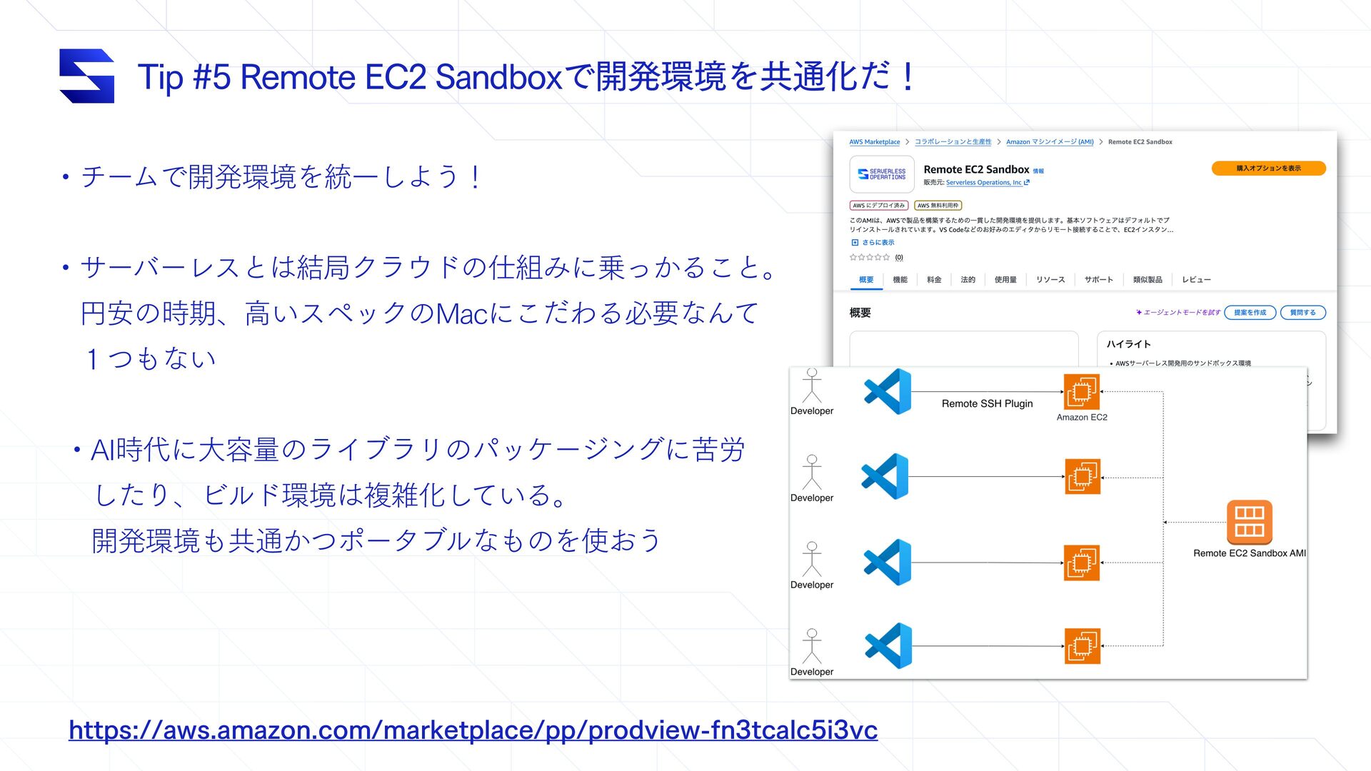 5JQ3FNPUF&$4BOECPYͰ։ൃڥΛڞ௨Խͩʂ ɾνʔϜͰ։ൃڥΛ౷Ұ͠Α͏ʂ ɾαʔόʔϨεͱ݁ہΫϥυͷΈʹ͔ͬΔ͜ͱɻ ɹԁ҆ͷ࣌ظɺߴ͍εϖοΫͷ.BDʹͩ͜ΘΔඞཁͳΜͯ ɹ̍ͭͳ͍ ɾ"*࣌ʹେ༰ྔͷϥΠϒϥϦͷύοέʔδϯάʹۤ࿑ ɹͨ͠ΓɺϏϧυڥෳࡶԽ͍ͯ͠Δɻ ɹ։ൃڥڞ௨͔ͭϙʔλϒϧͳͷΛ͓͏ IUUQTBXTBNB[PODPNNBSLFUQMBDFQQQSPEWJFXGOUDBMDJWD