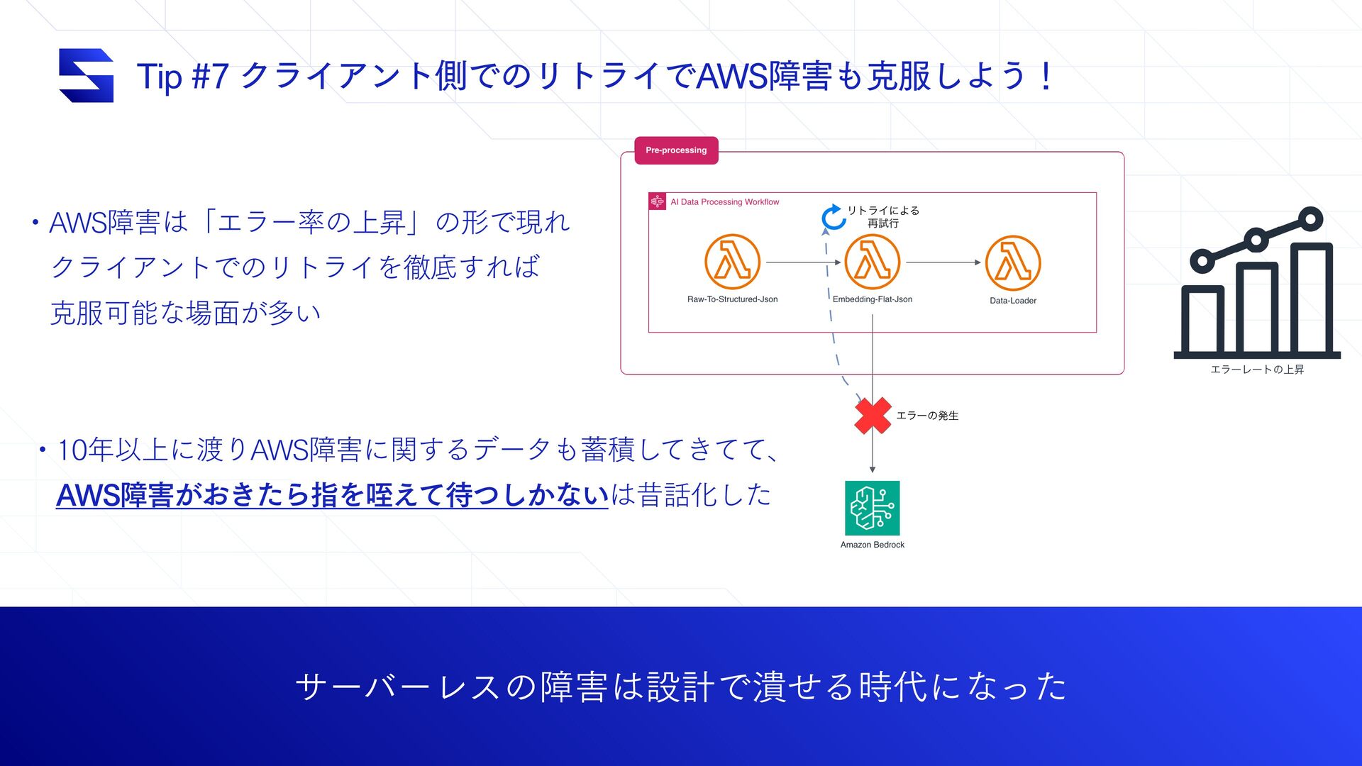 5JQΫϥΠΞϯτଆͰͷϦτϥΠͰ"84োࠀ͠Α͏ʂ αʔόʔϨεͷোઃܭͰ௵ͤΔ࣌ʹͳͬͨ ɾ"84োʮΤϥʔͷ্ঢʯͷܗͰݱΕ ɹΫϥΠΞϯτͰͷϦτϥΠΛపఈ͢Ε ɹࠀՄೳͳ໘͕ଟ͍ ɾҎ্ʹΓ"84োʹؔ͢Δσʔλੵ͖ͯͯͯ͠ɺ ɹ"84ো͕͓͖ͨΒࢦΛᄏ͔͑ͯͭ͠ͳ͍ੲԽͨ͠