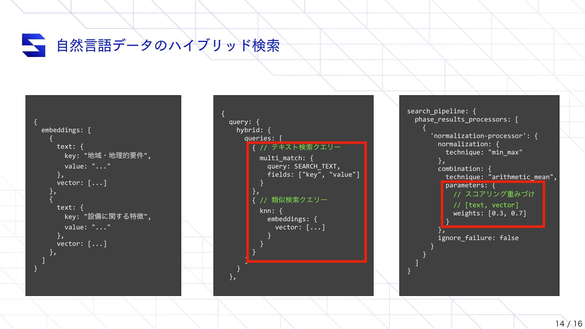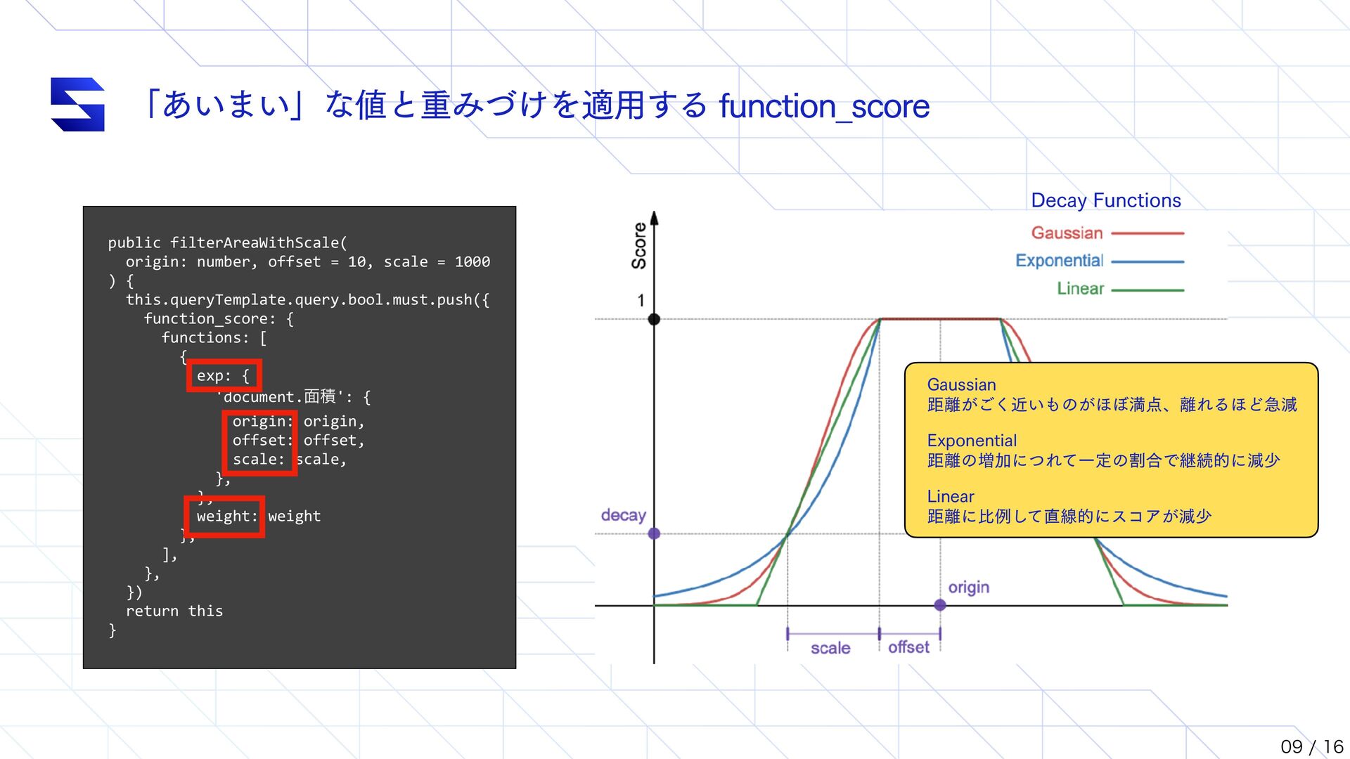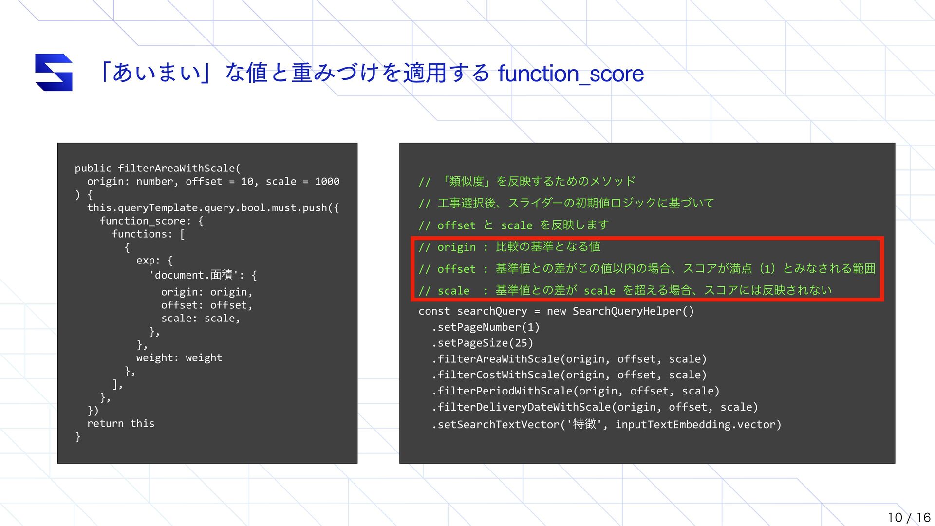 1000 ) { this.queryTemplate.query.bool.must.push({ function_score: { functions: [ { exp: { 'document.໘ੵ': { origin: origin, offset: offset, scale: scale, }, }, weight: weight }, ], }, }) return this } // ʮྨࣅʯΛө͢ΔͨΊͷϝιου // ࣄબޙɺεϥΠμʔͷॳظϩδοΫʹج͍ͮͯ // offset ͱ scale Λө͠·͢ // origin : ൺֱͷج४ͱͳΔ // offset : ج४ͱͷ͕ࠩ͜ͷҎͷ߹ɺείΞ͕ຬʢ1ʣͱΈͳ͞ΕΔൣғ // scale : ج४ͱͷ͕ࠩ scale Λ͑Δ߹ɺείΞʹө͞Εͳ͍ const searchQuery = new SearchQueryHelper() .setPageNumber(1) .setPageSize(25) .filterAreaWithScale(origin, offset, scale) .filterCostWithScale(origin, offset, scale) .filterPeriodWithScale(origin, offset, scale) .filterDeliveryDateWithScale(origin, offset, scale) .setSearchTextVector('ಛ', inputTextEmbedding.vector)