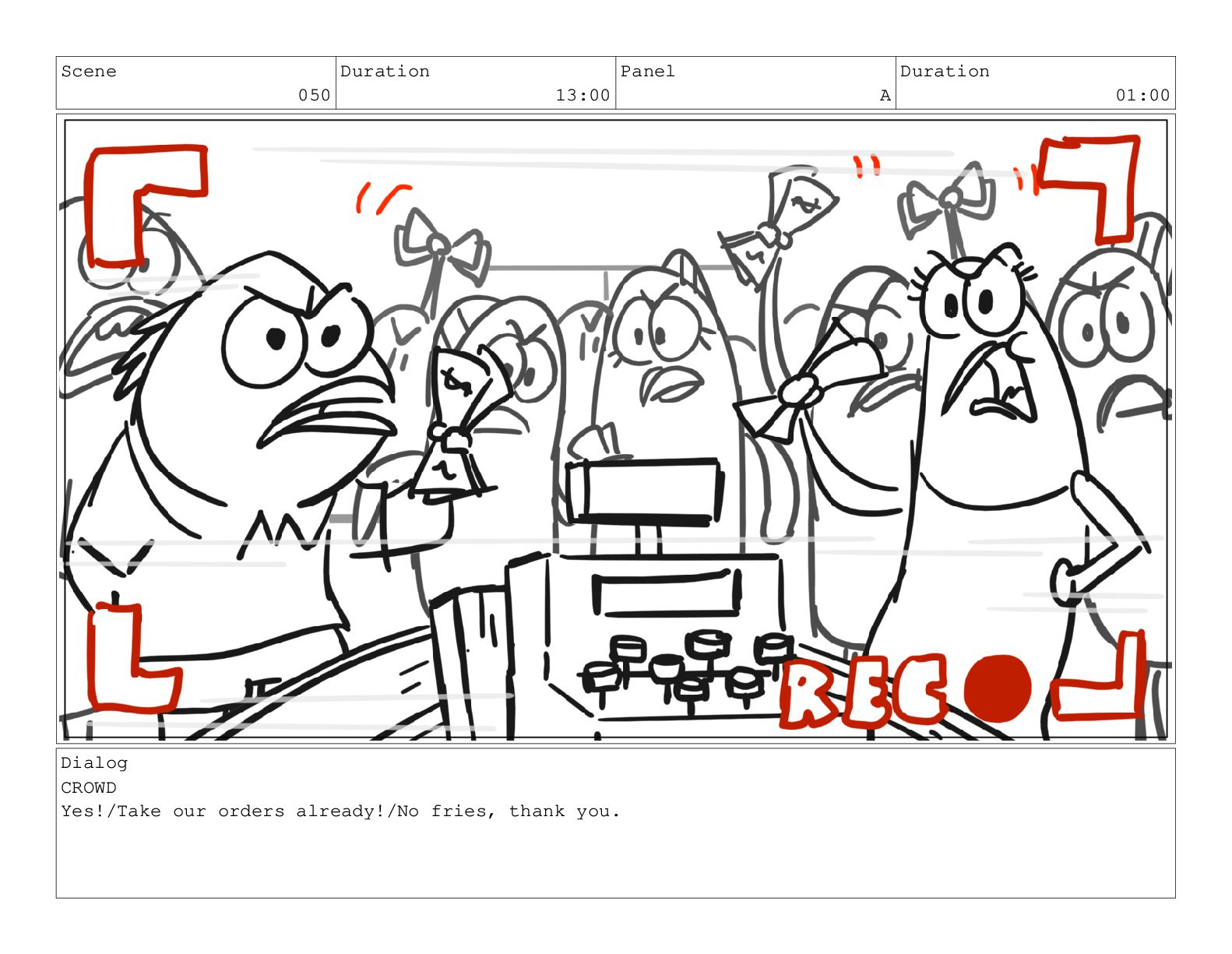Scene 050 Duration 13:00 Panel A Duration 01:00 Dialog CROWD