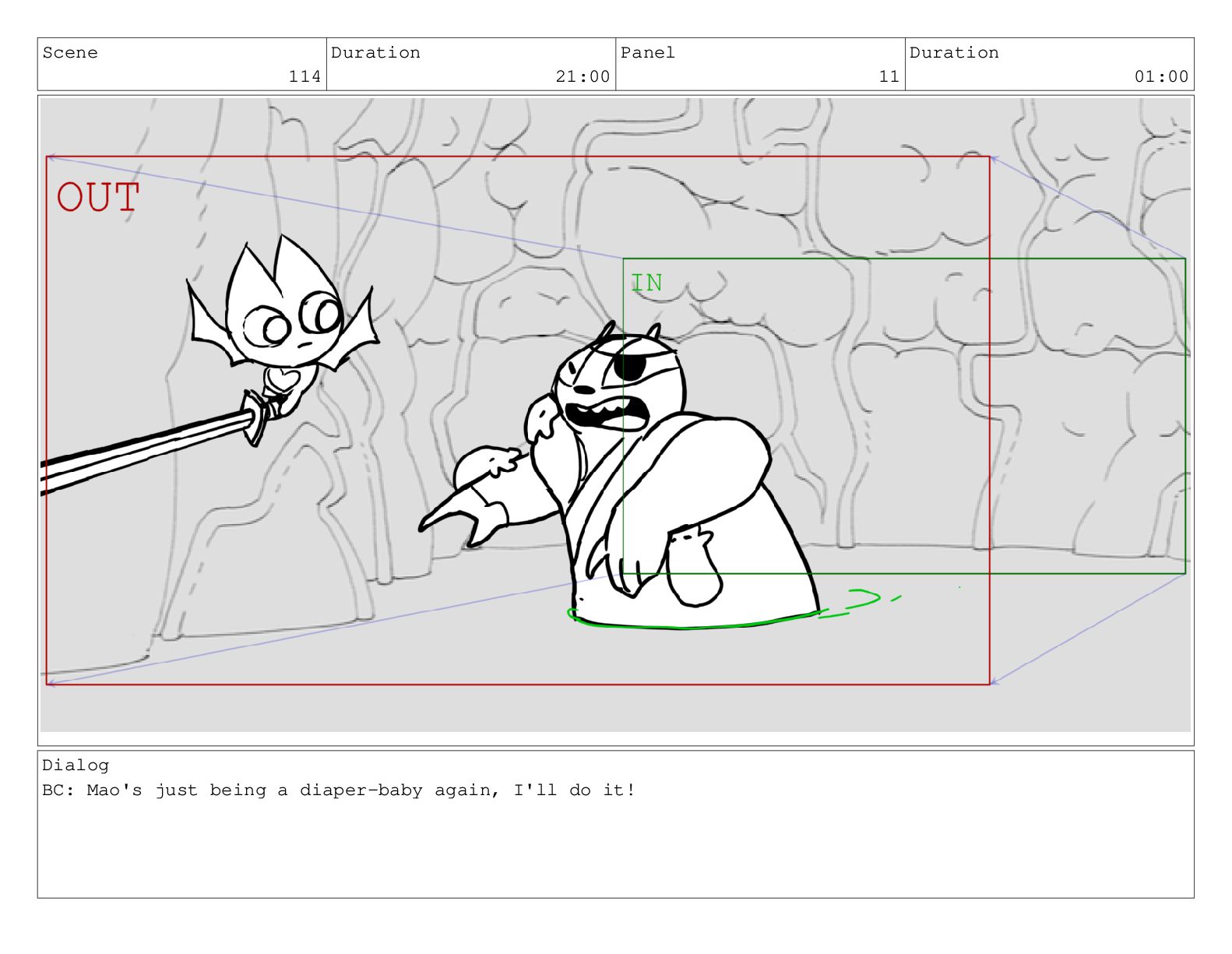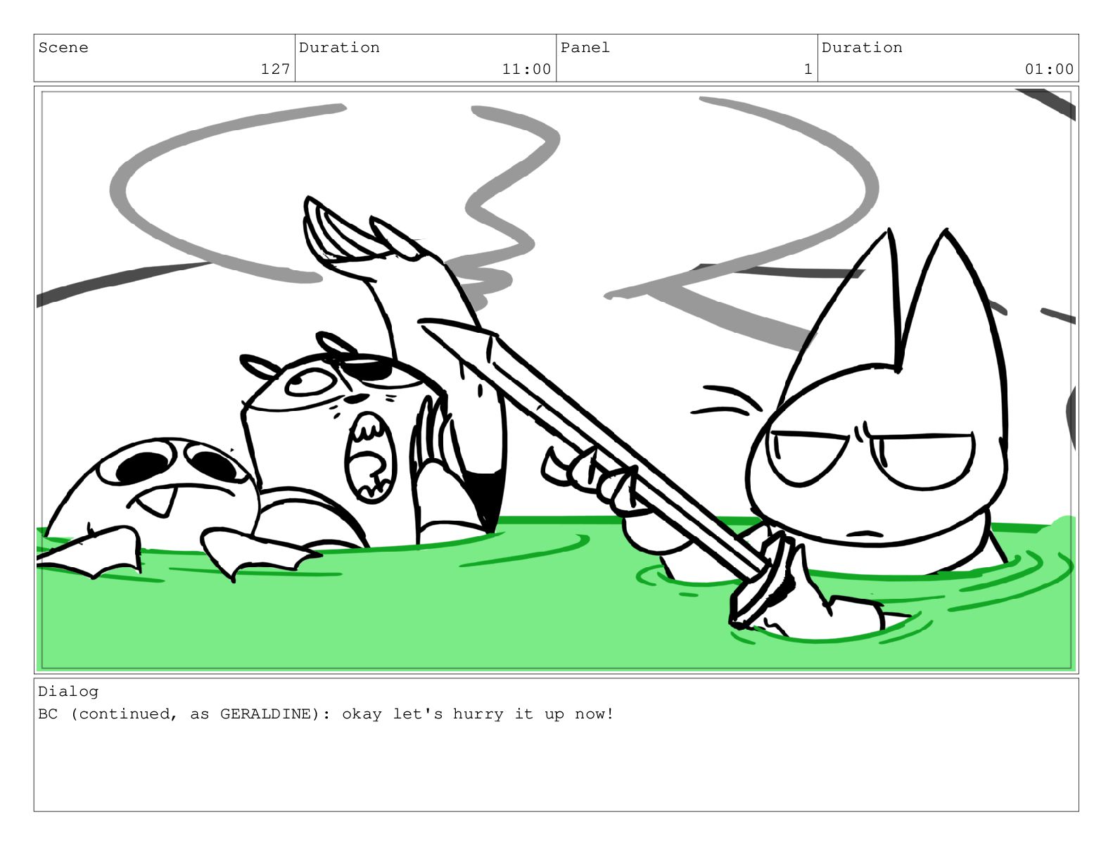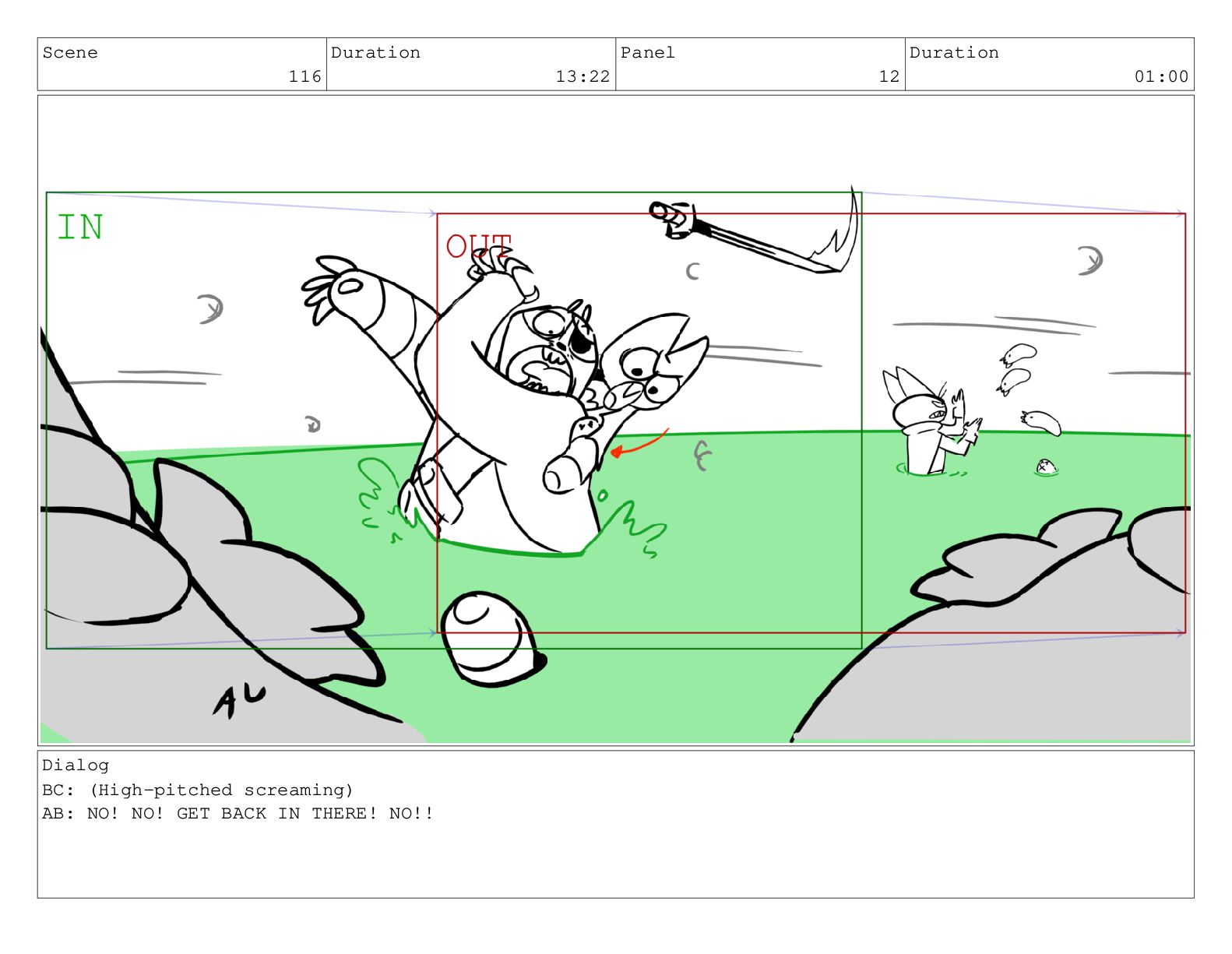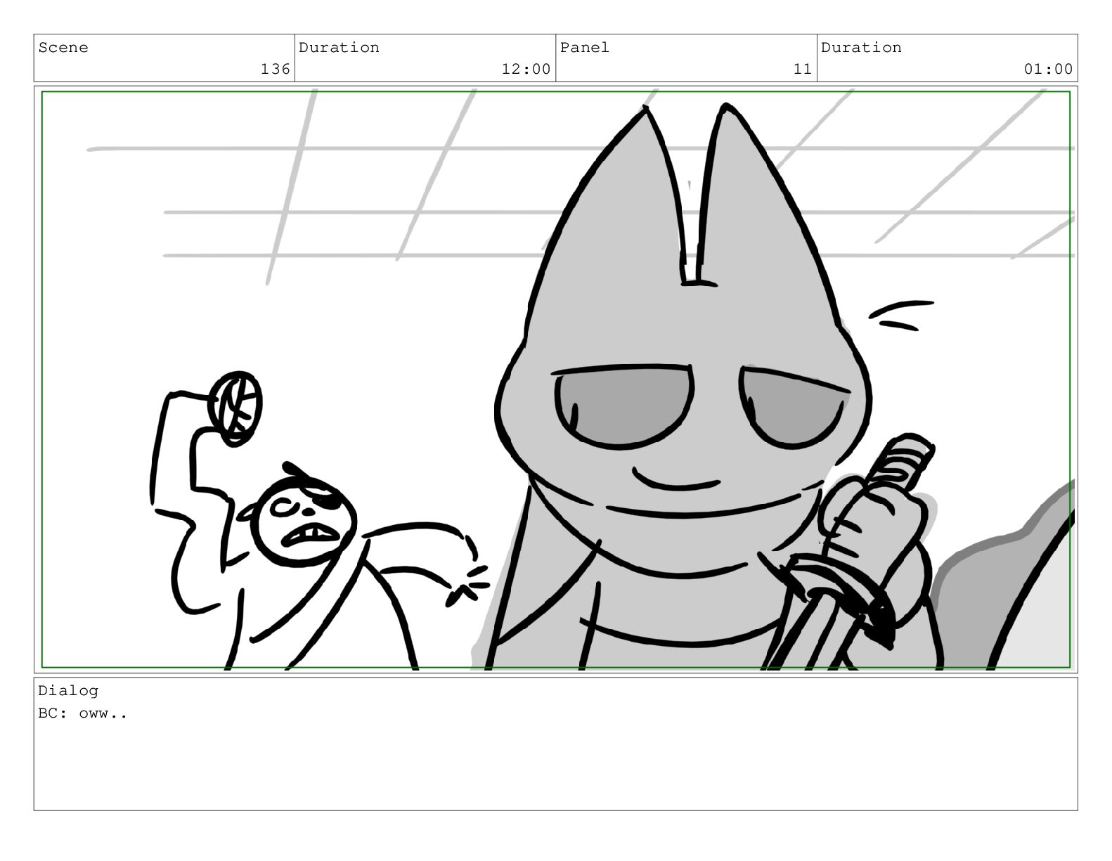 Scene 136 Duration 12:00 Panel 11 Duration 01:00 Dialog BC: