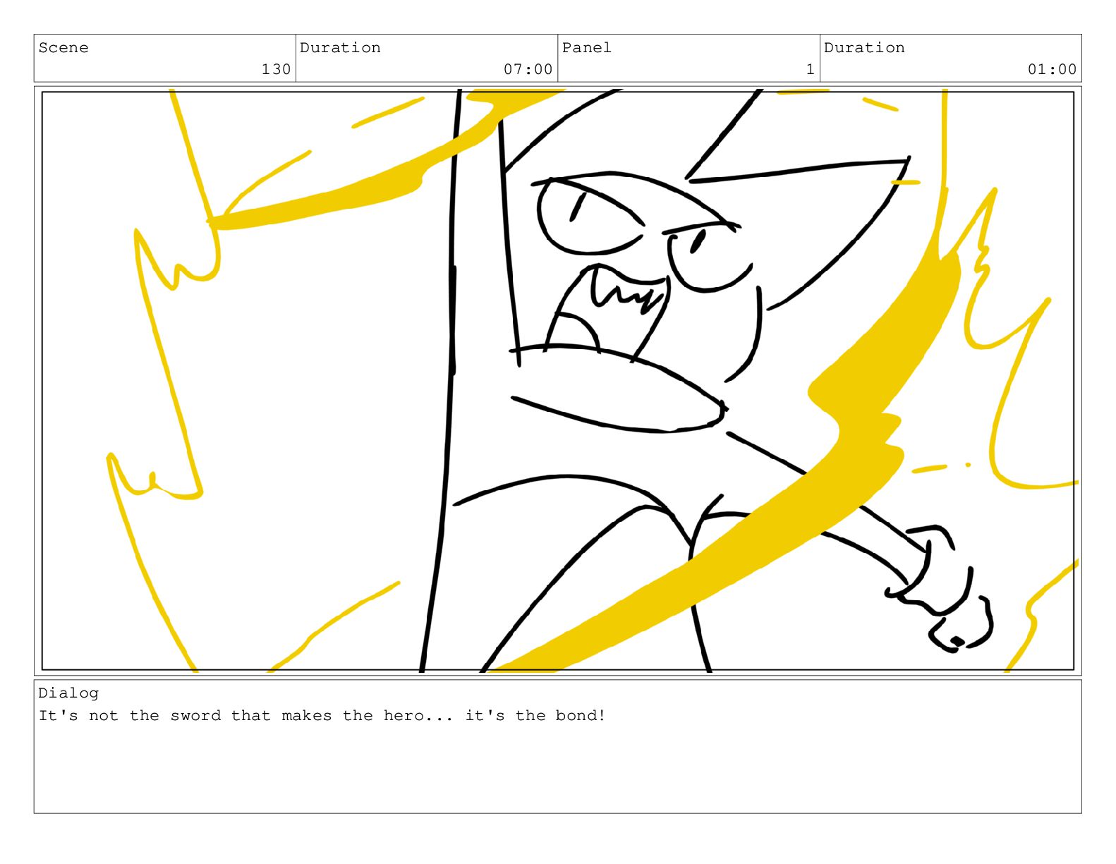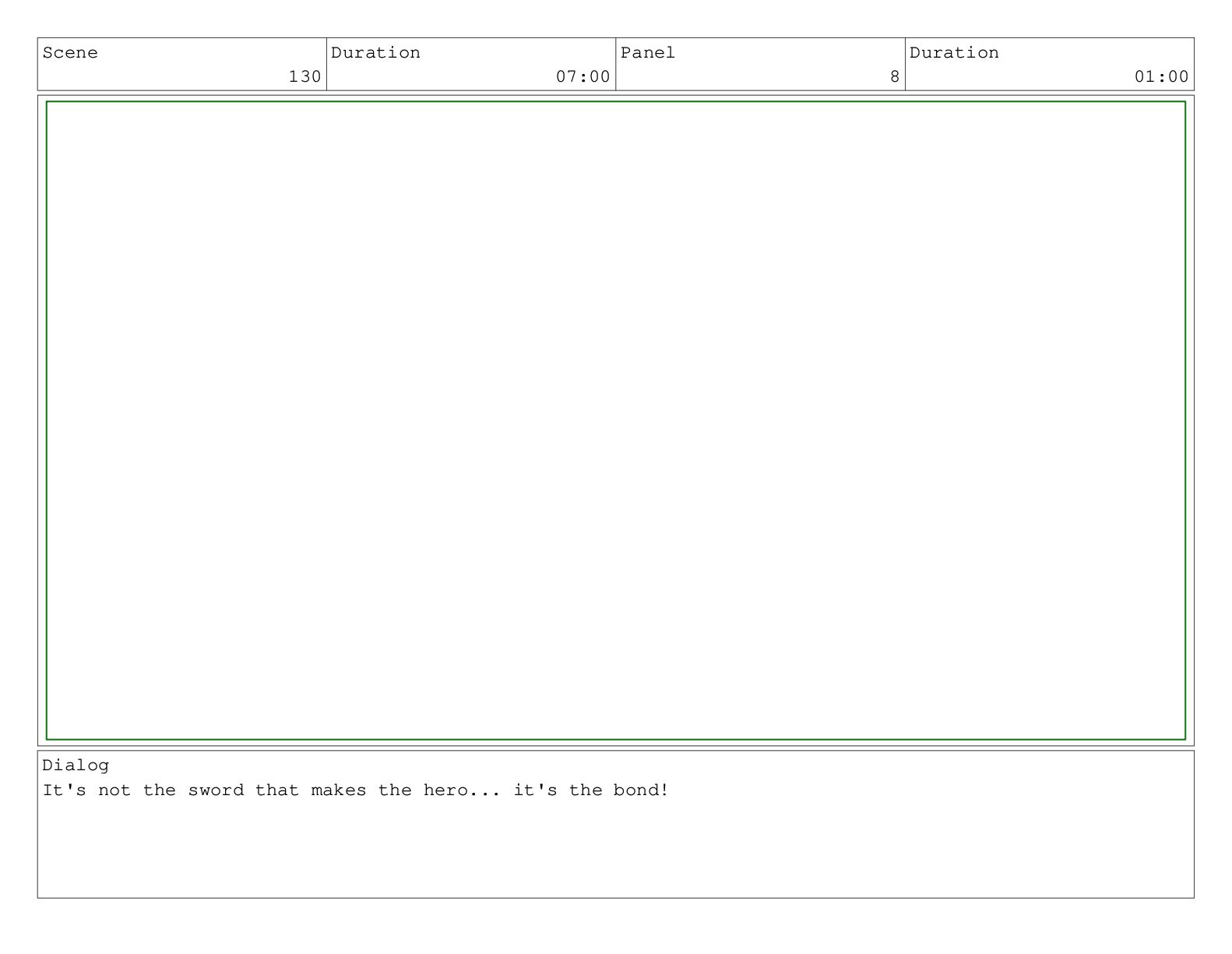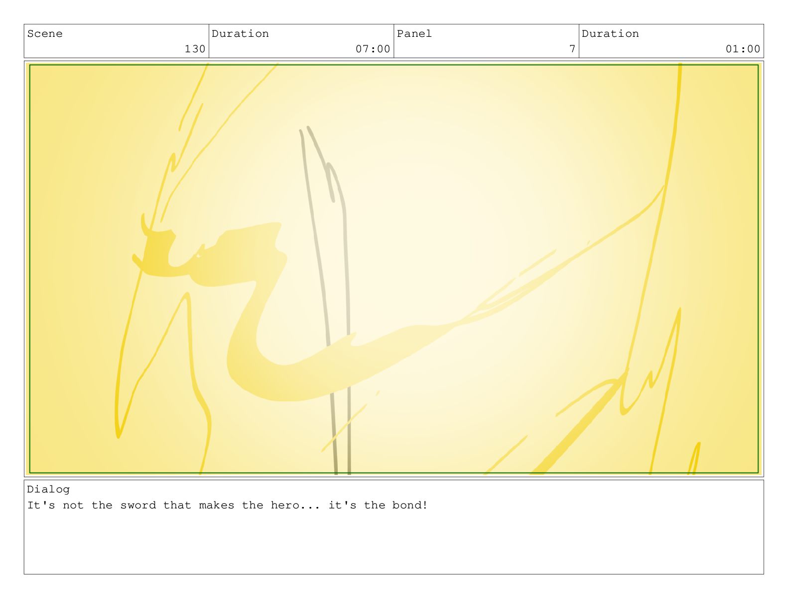 Scene 130 Duration 07:00 Panel 7 Duration 01:00 Dialog It's