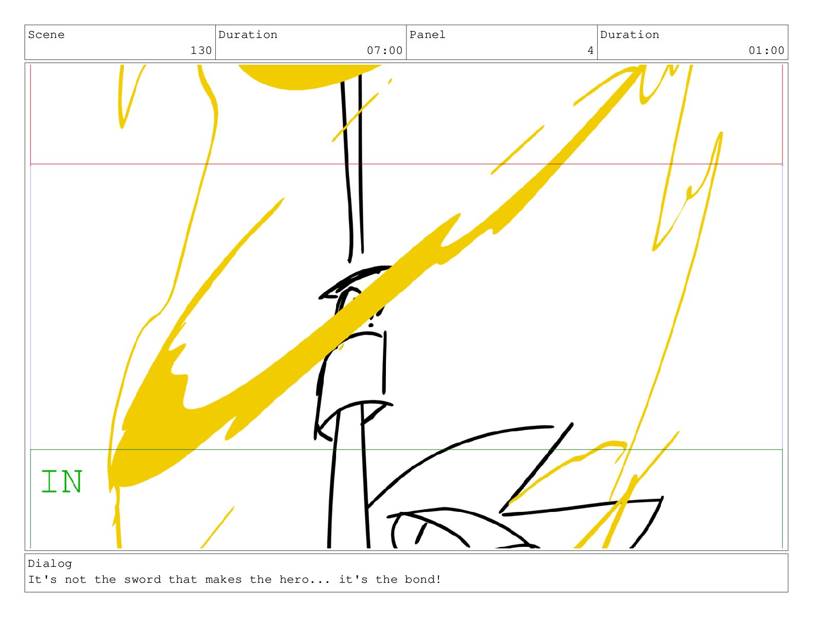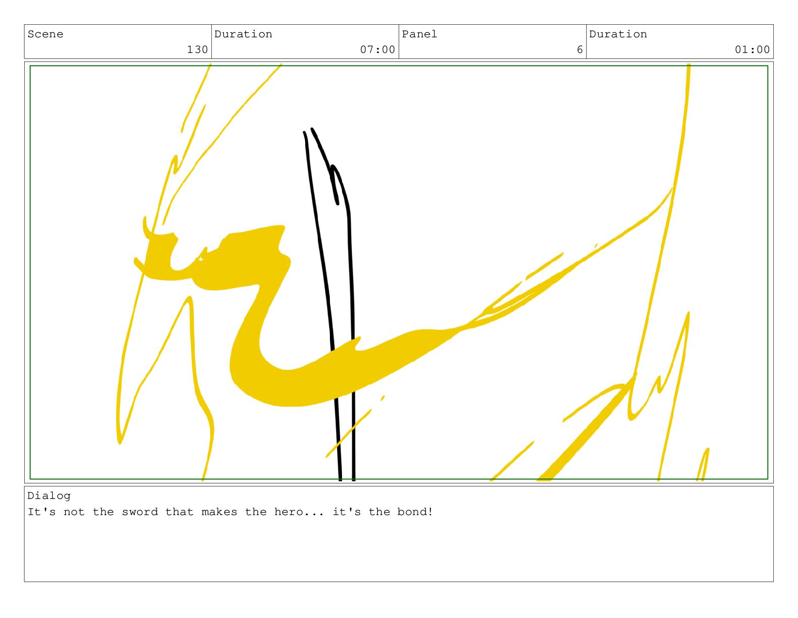 Scene 130 Duration 07:00 Panel 6 Duration 01:00 Dialog It's