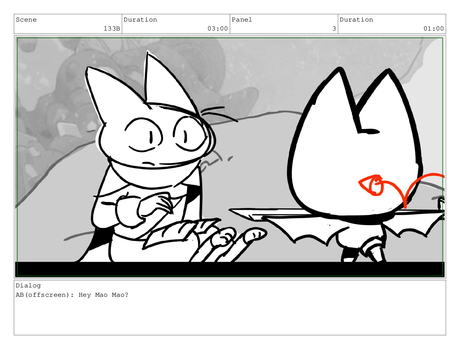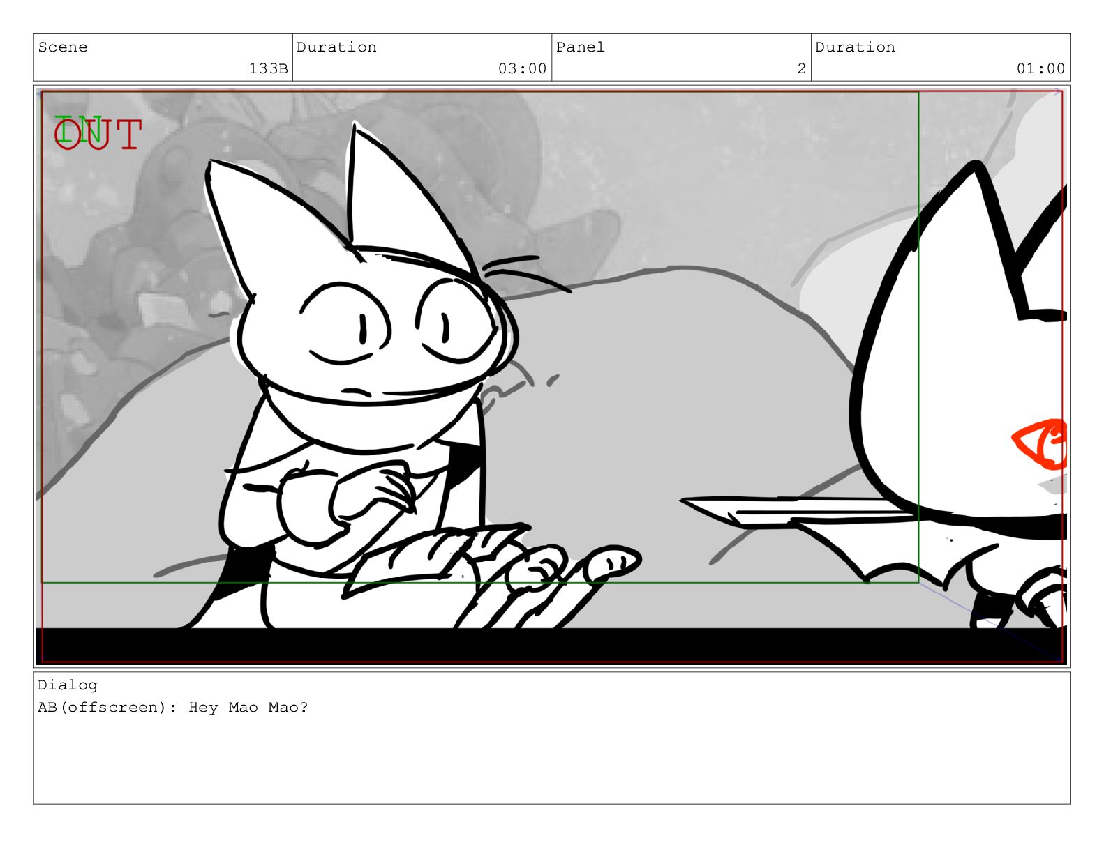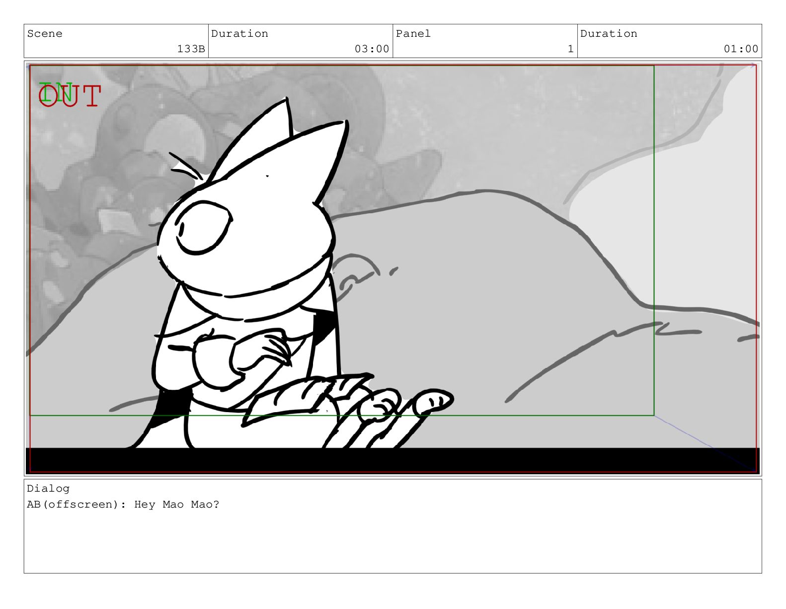Scene 133B Duration 03:00 Panel 1 Duration 01:00 Dialog AB(offscreen):