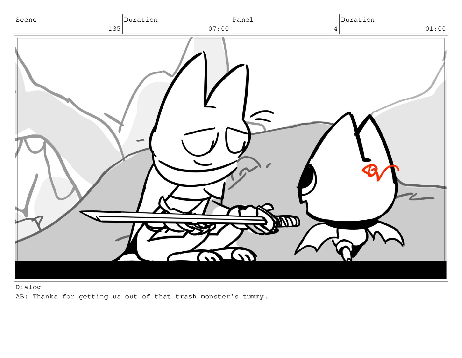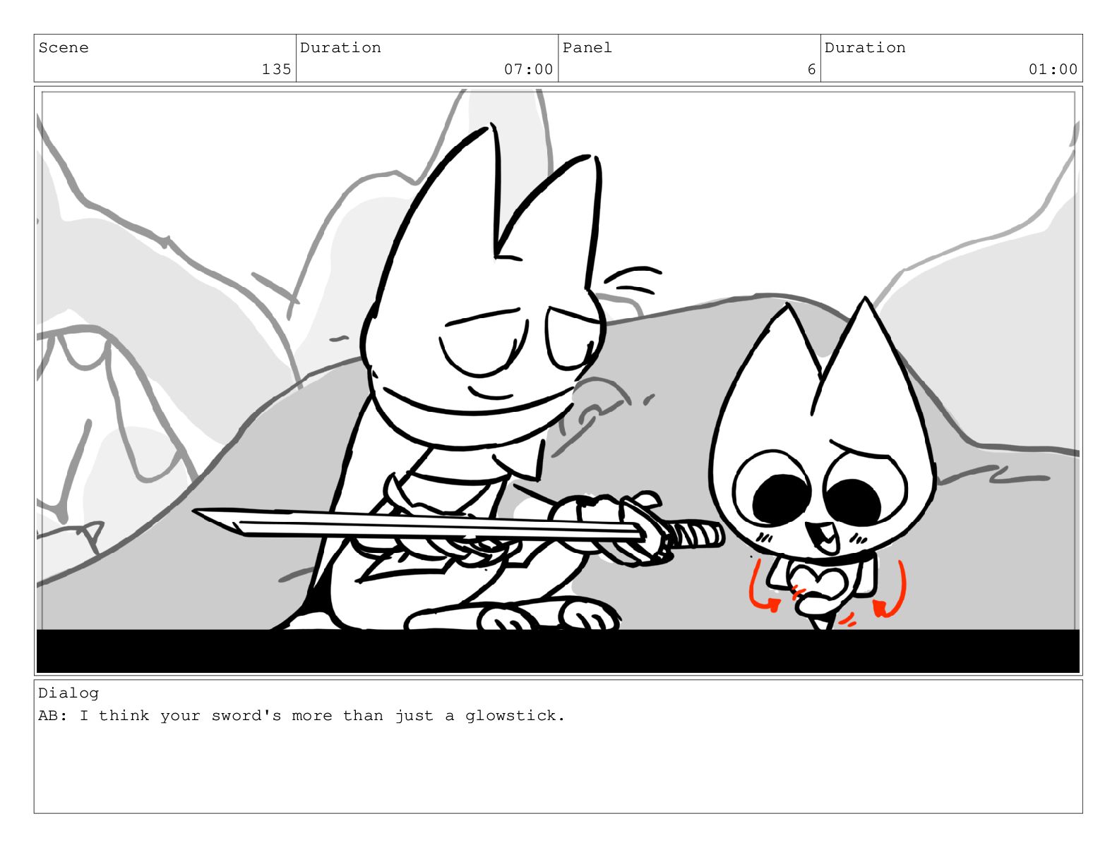 Scene 135 Duration 07:00 Panel 6 Duration 01:00 Dialog AB:
