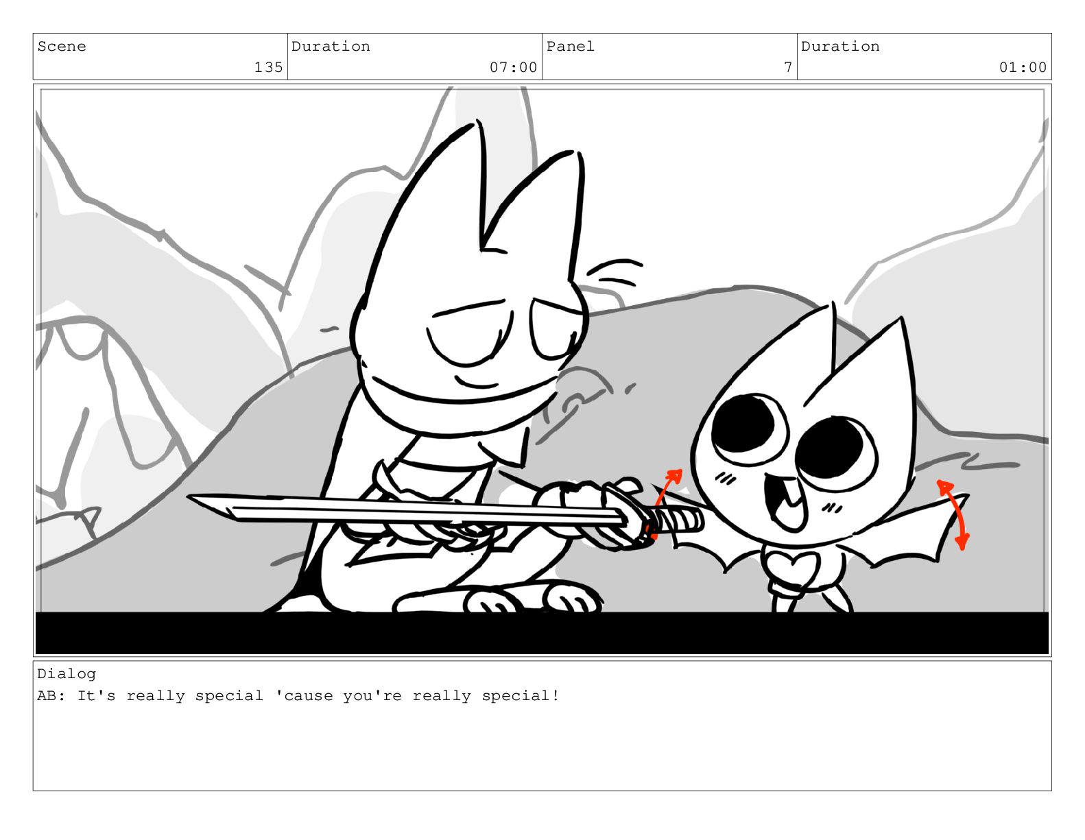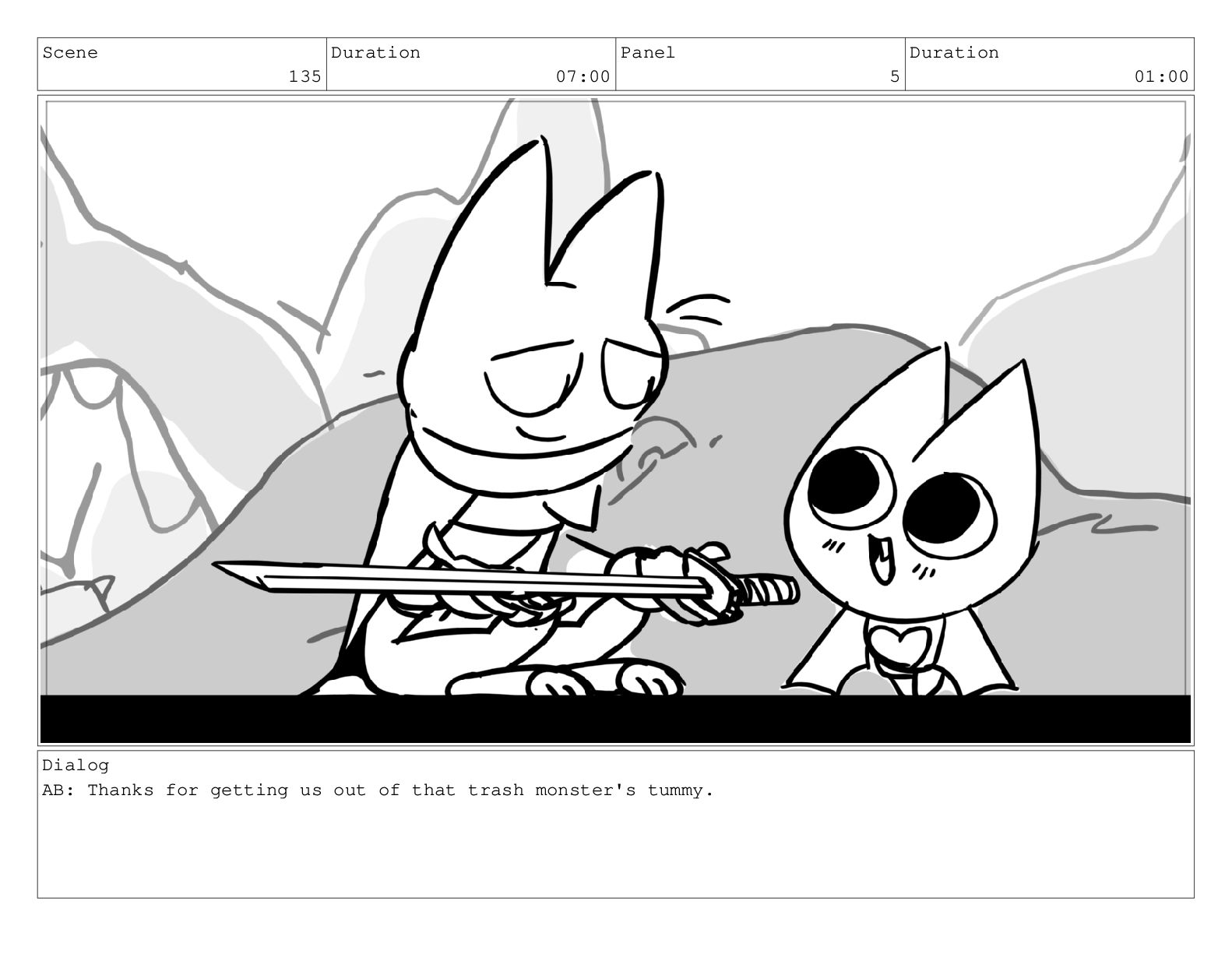 Scene 135 Duration 07:00 Panel 7 Duration 01:00 Dialog AB: