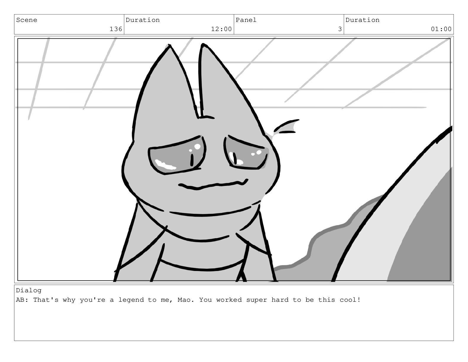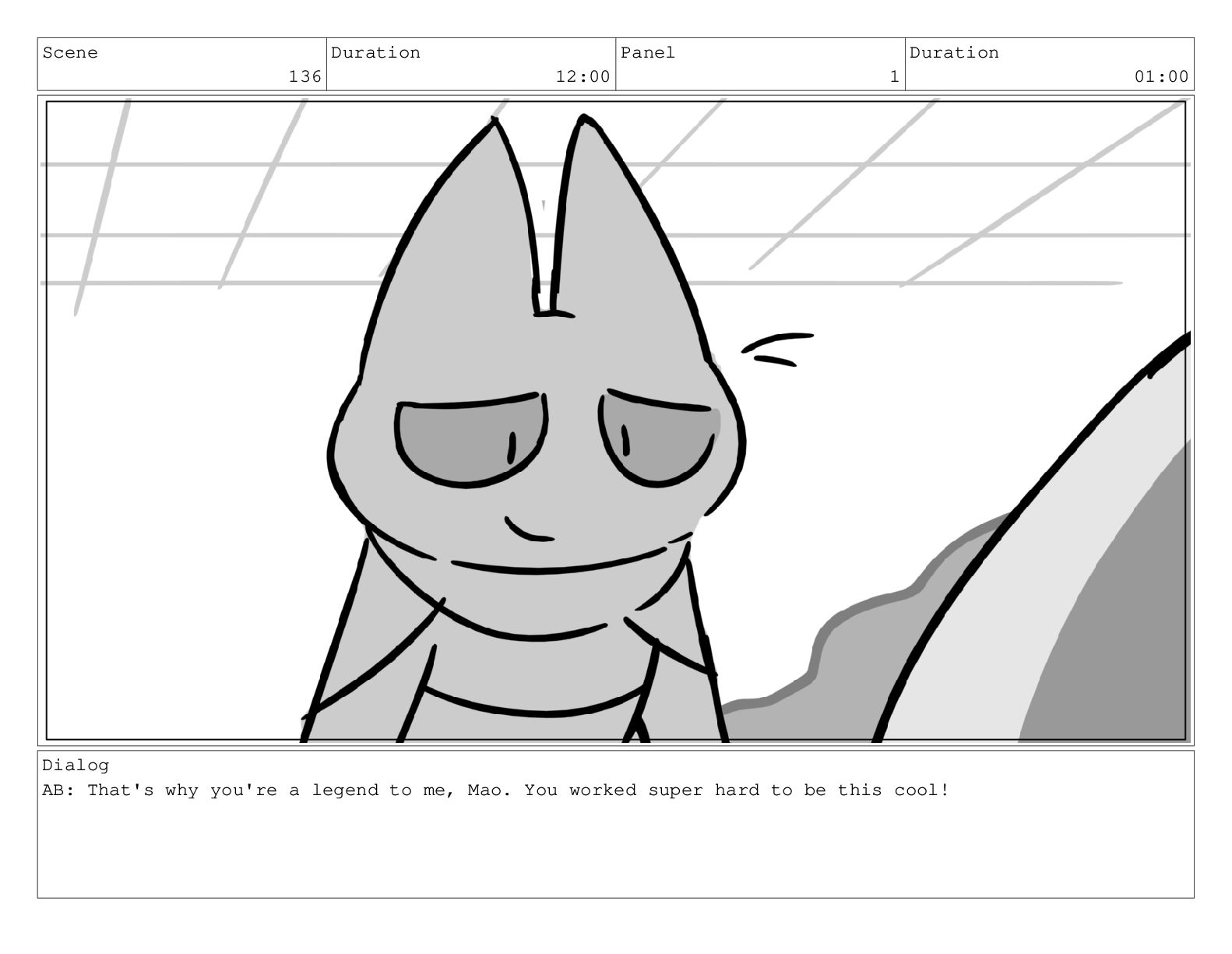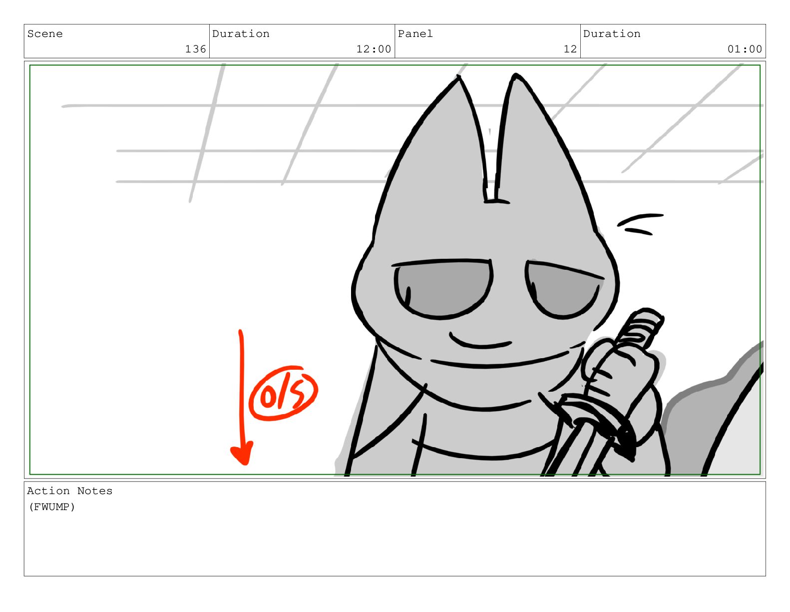 Scene 136 Duration 12:00 Panel 12 Duration 01:00 Action Notes