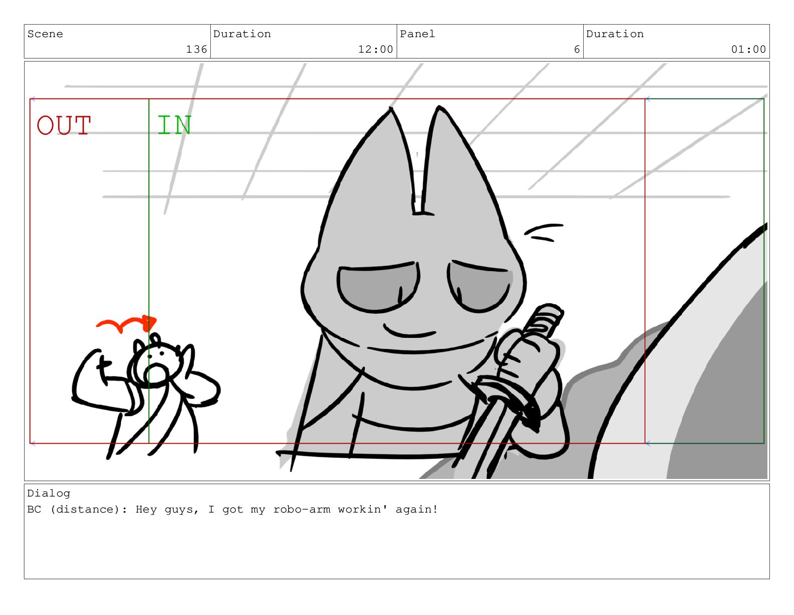 Scene 136 Duration 12:00 Panel 6 Duration 01:00 Dialog BC
