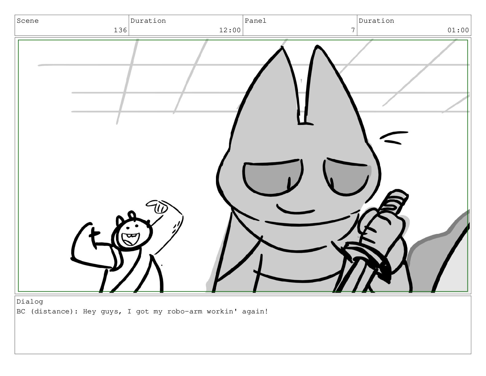 Scene 136 Duration 12:00 Panel 7 Duration 01:00 Dialog BC