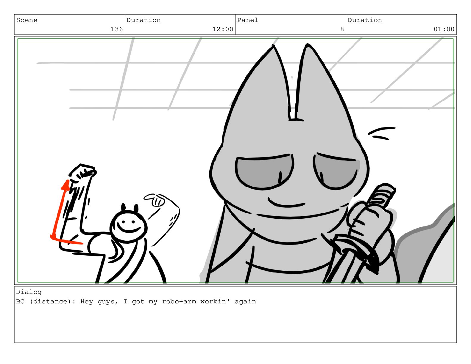 Scene 136 Duration 12:00 Panel 8 Duration 01:00 Dialog BC