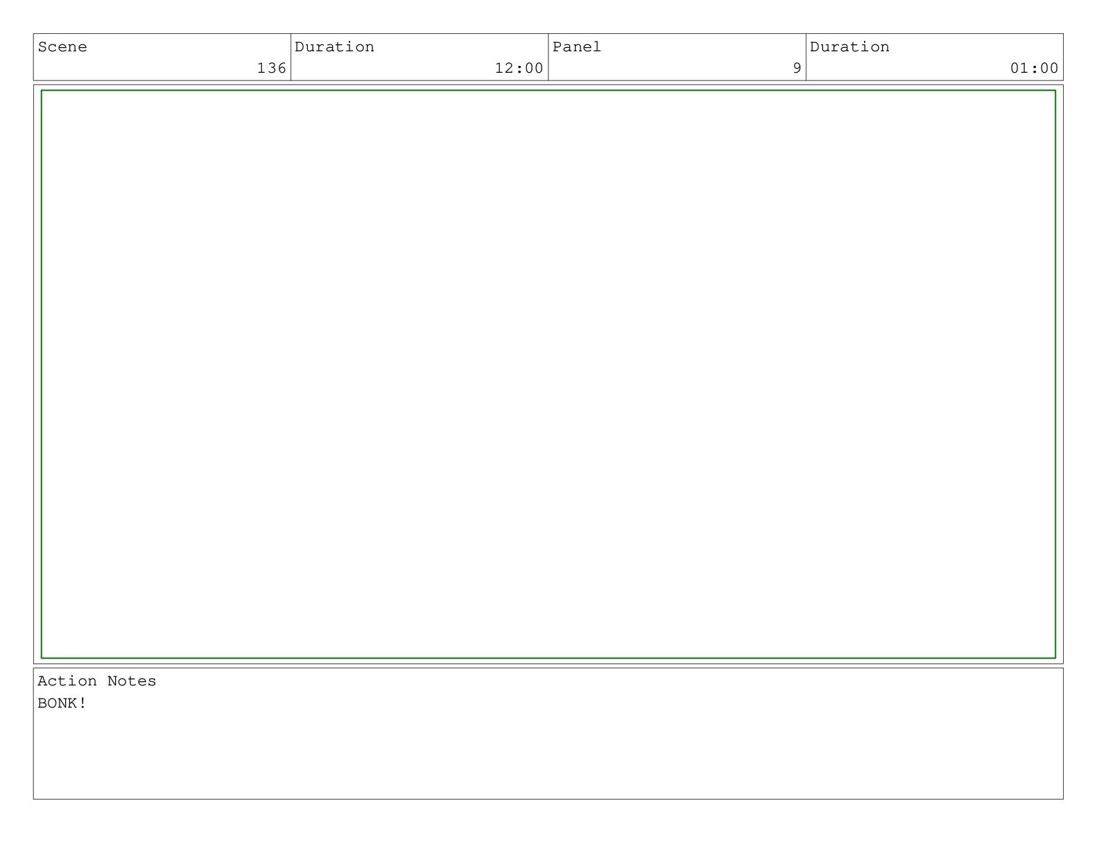 Scene 136 Duration 12:00 Panel 9 Duration 01:00 Action Notes