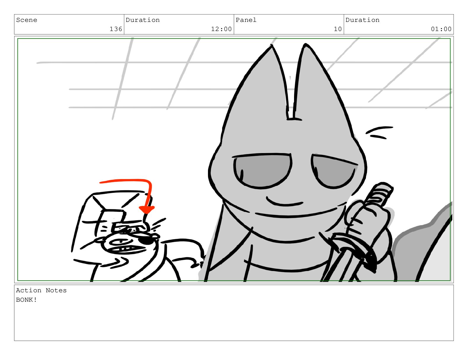 Scene 136 Duration 12:00 Panel 10 Duration 01:00 Action Notes