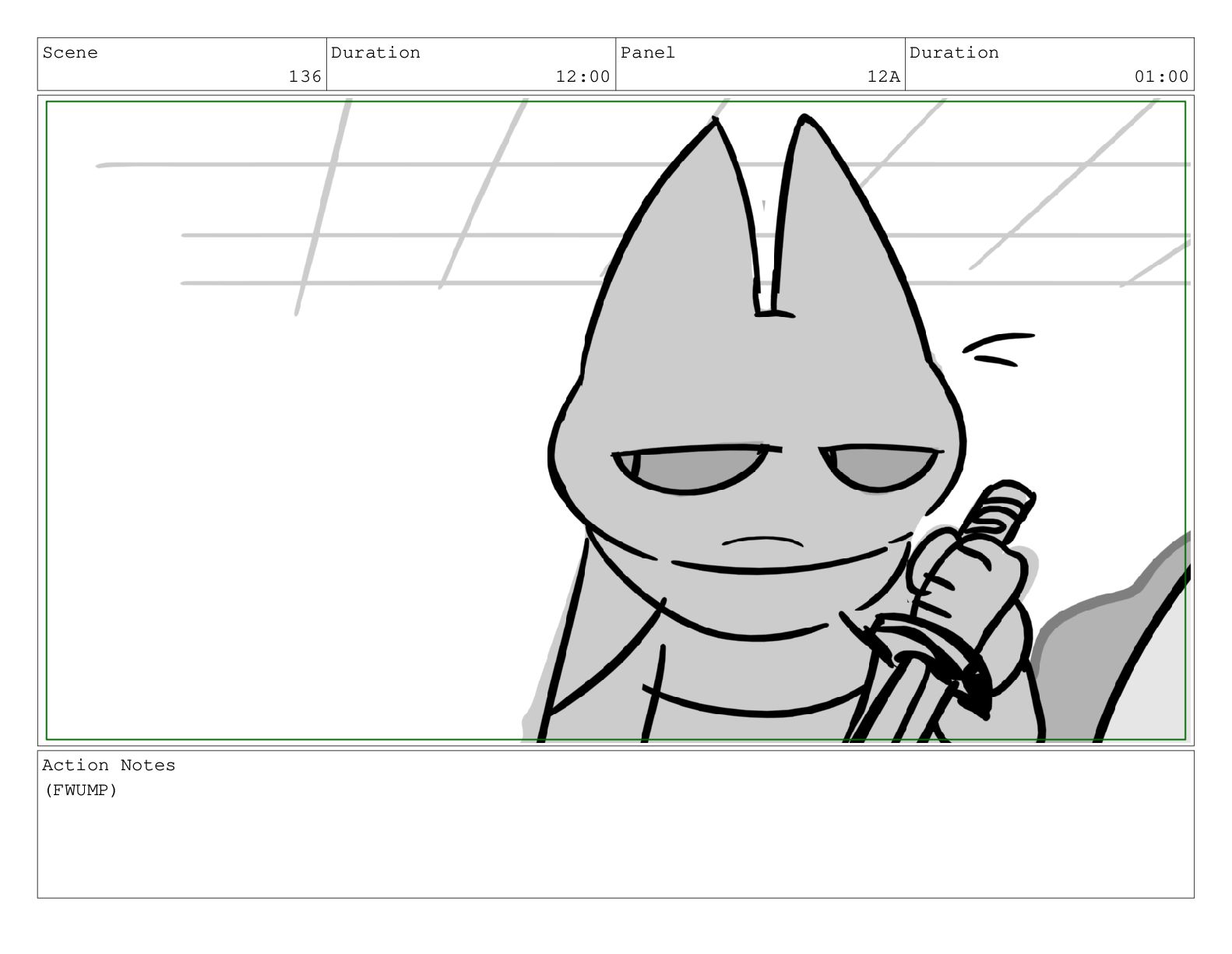 Scene 136 Duration 12:00 Panel 12A Duration 01:00 Action Notes