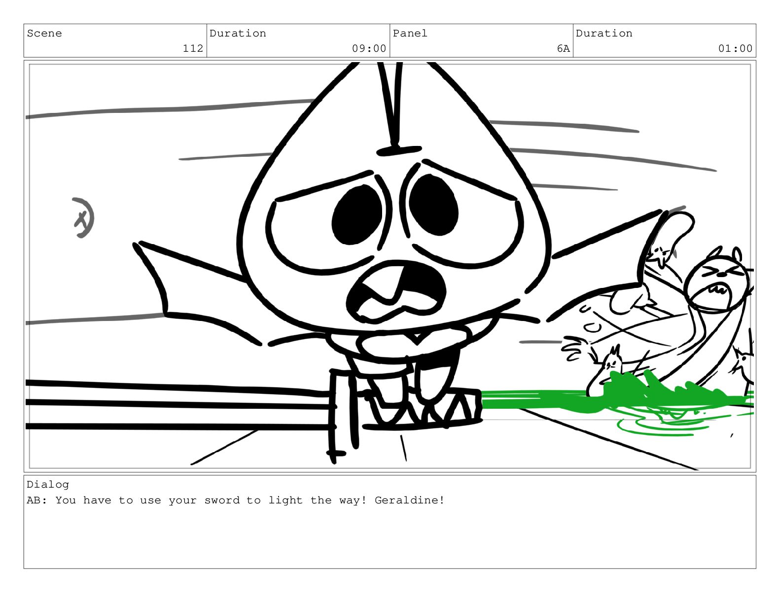 Scene 112 Duration 09:00 Panel 6A Duration 01:00 Dialog AB: