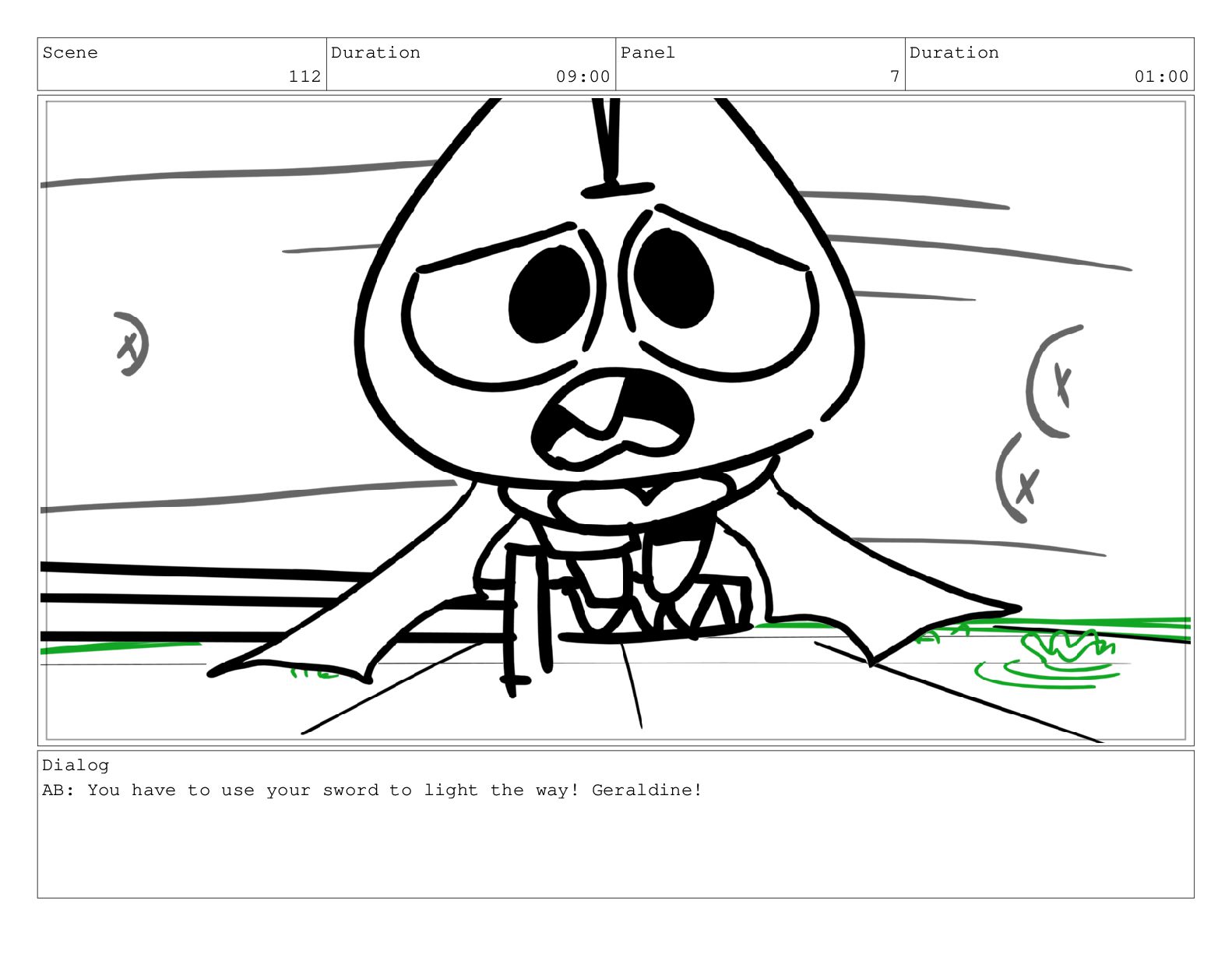 Scene 112 Duration 09:00 Panel 1 Duration 01:00 Dialog BC: