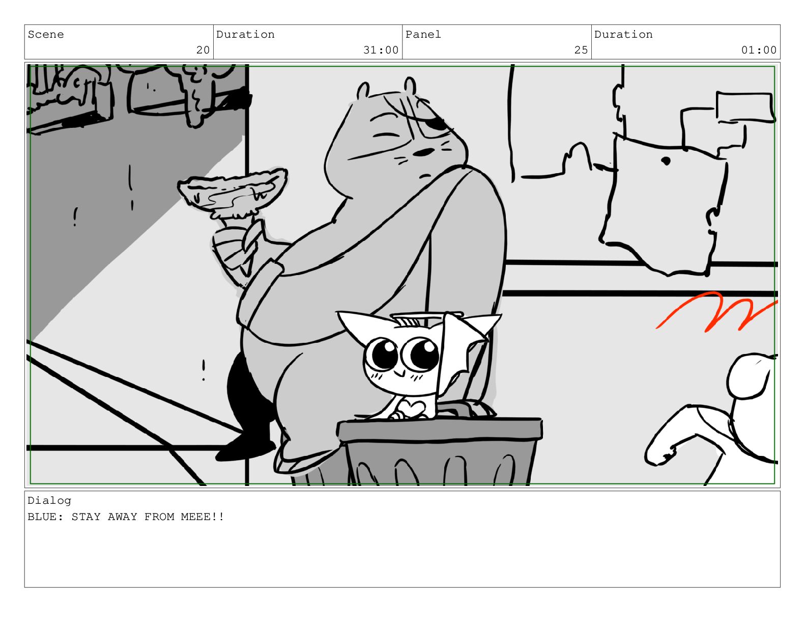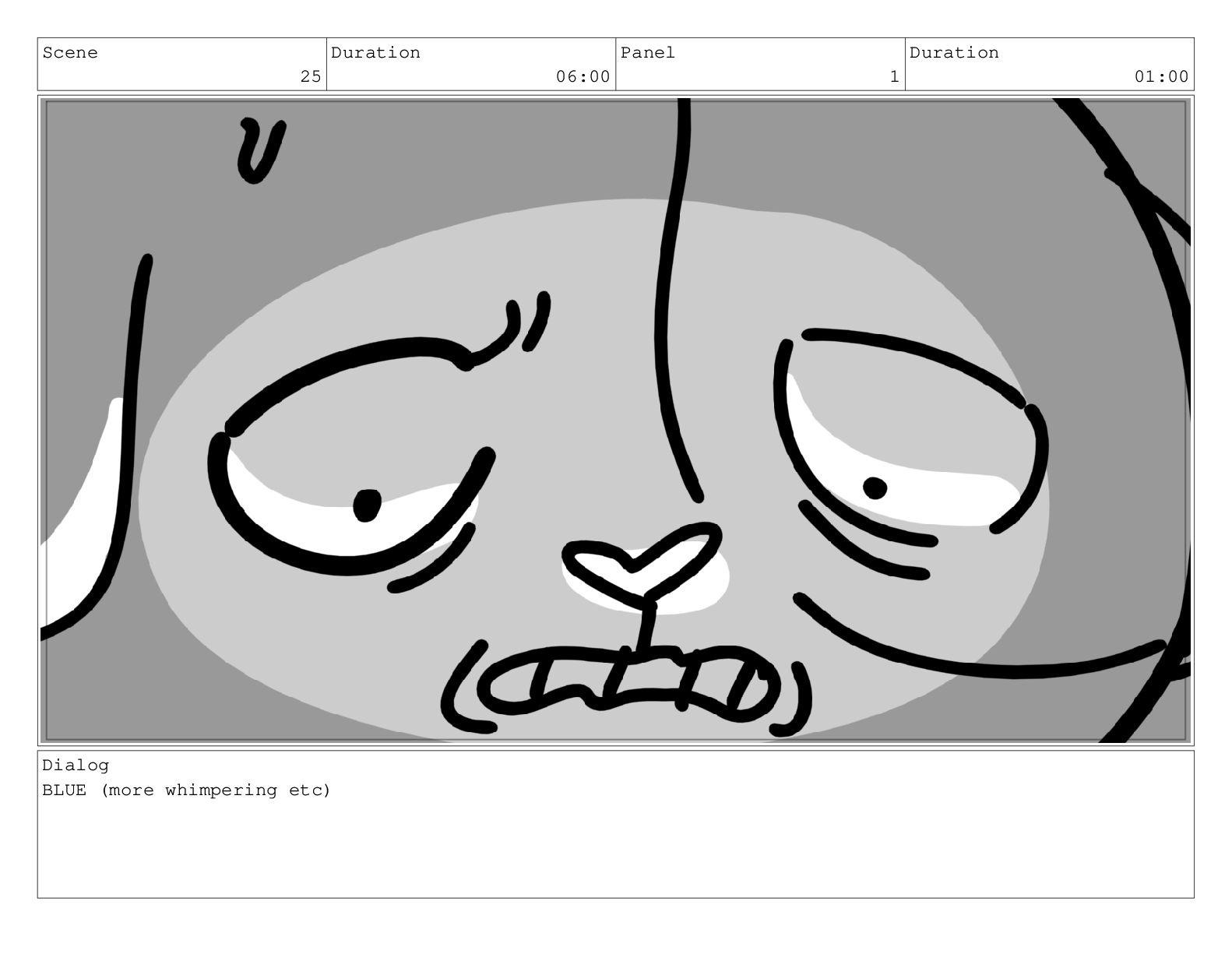 Scene 25 Duration 06:00 Panel 1 Duration 01:00 Dialog BLUE