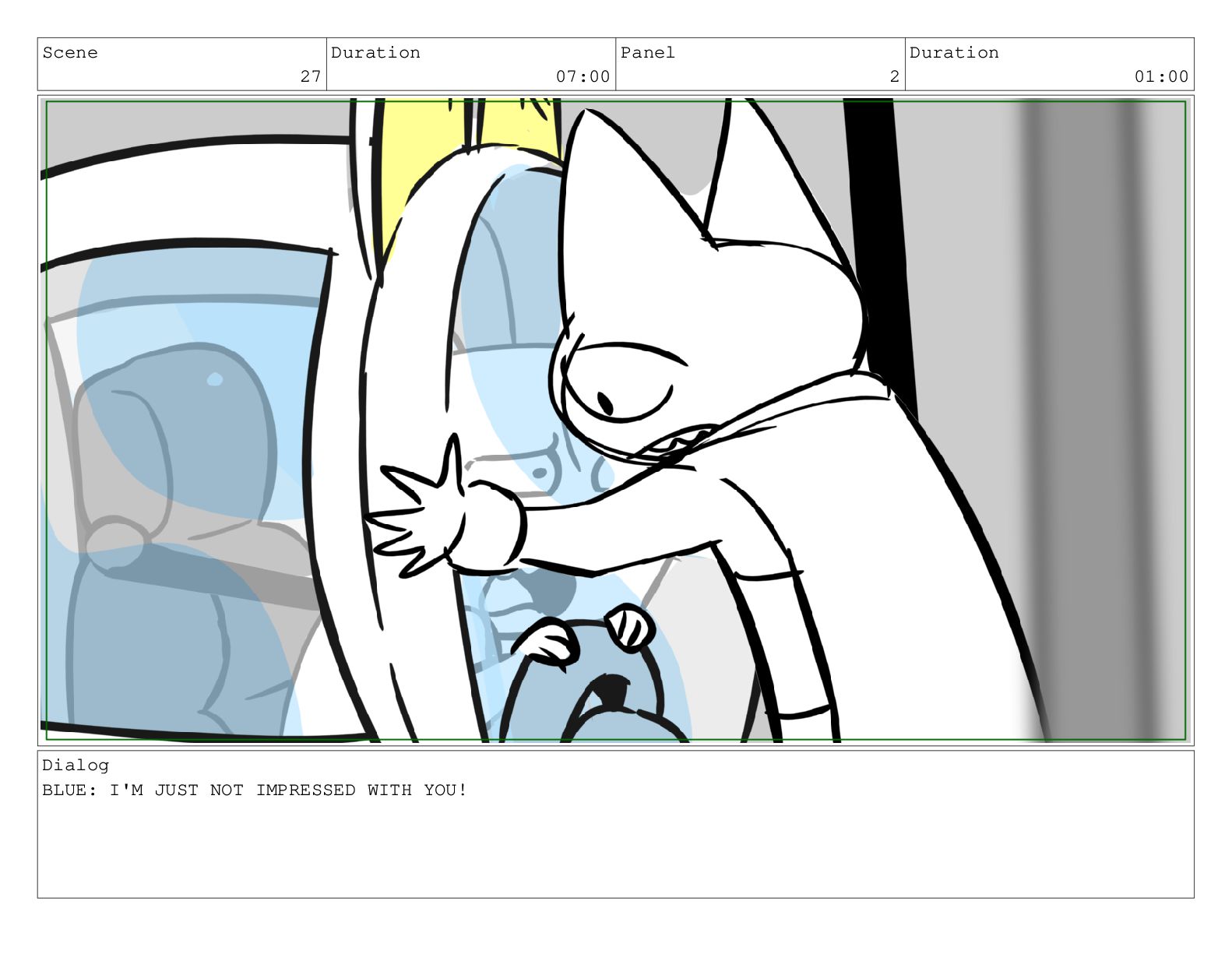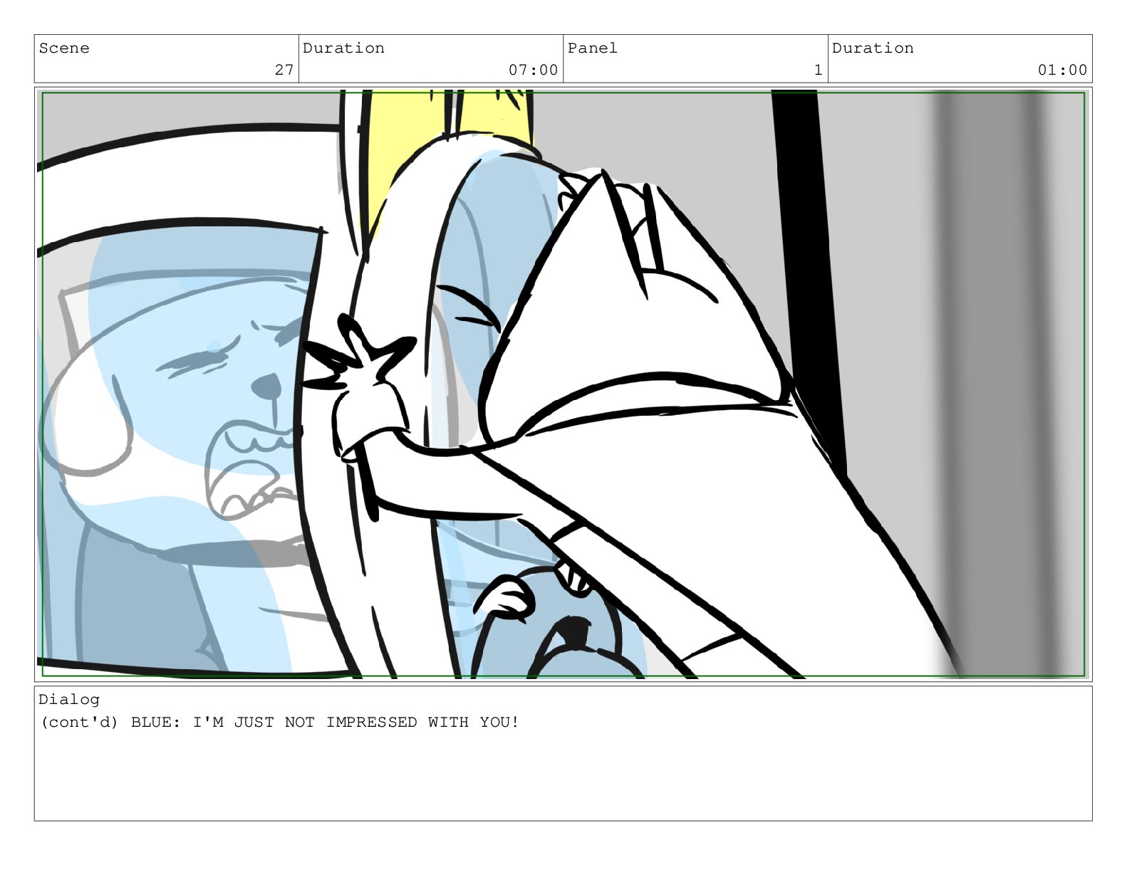 Scene 27 Duration 07:00 Panel 2 Duration 01:00 Dialog BLUE: