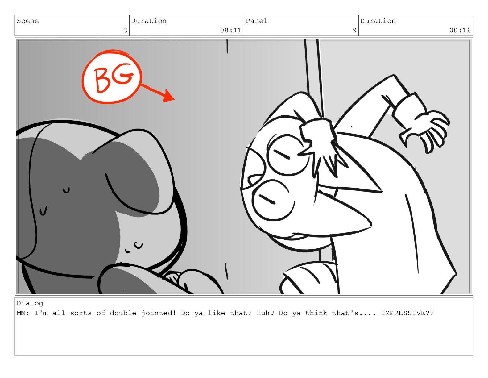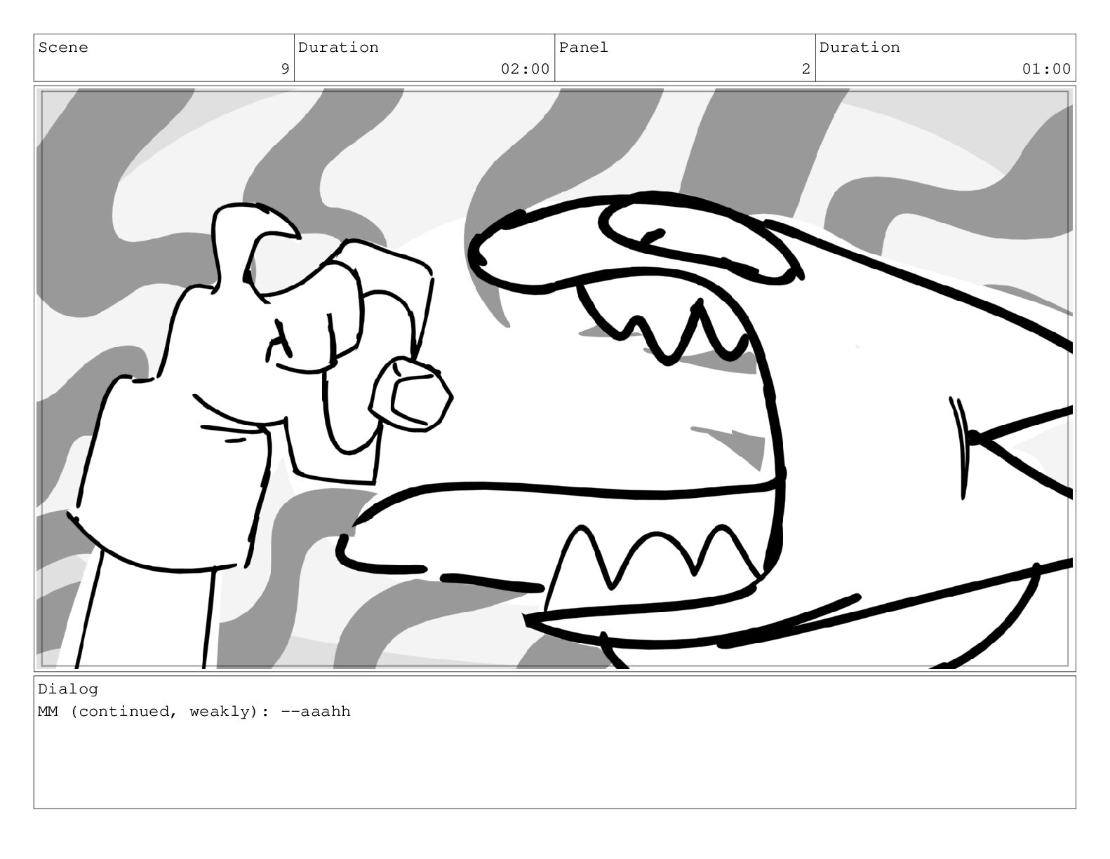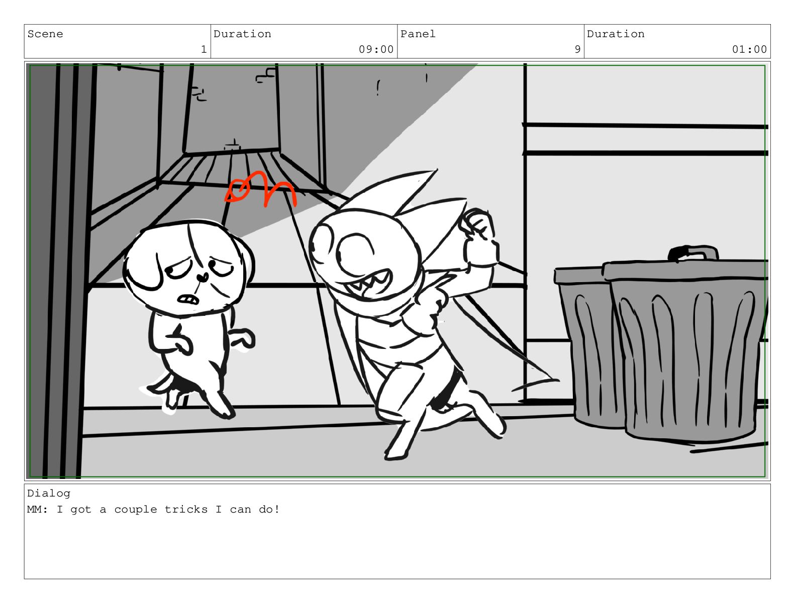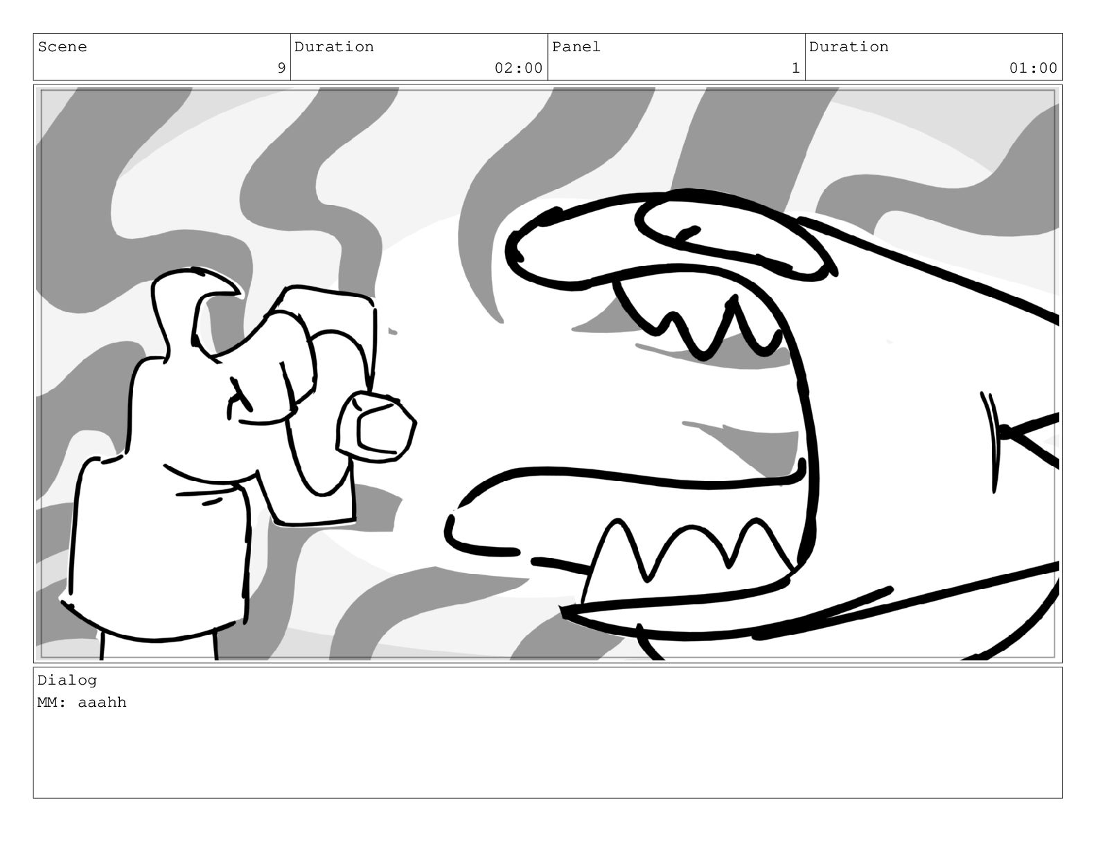 Scene 1 Duration 09:00 Panel 9 Duration 01:00 Dialog MM: