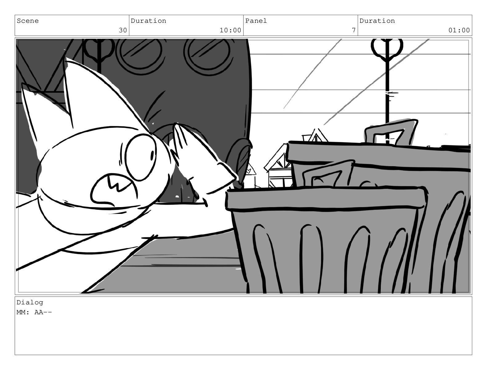 Scene 30 Duration 10:00 Panel 7 Duration 01:00 Dialog MM: