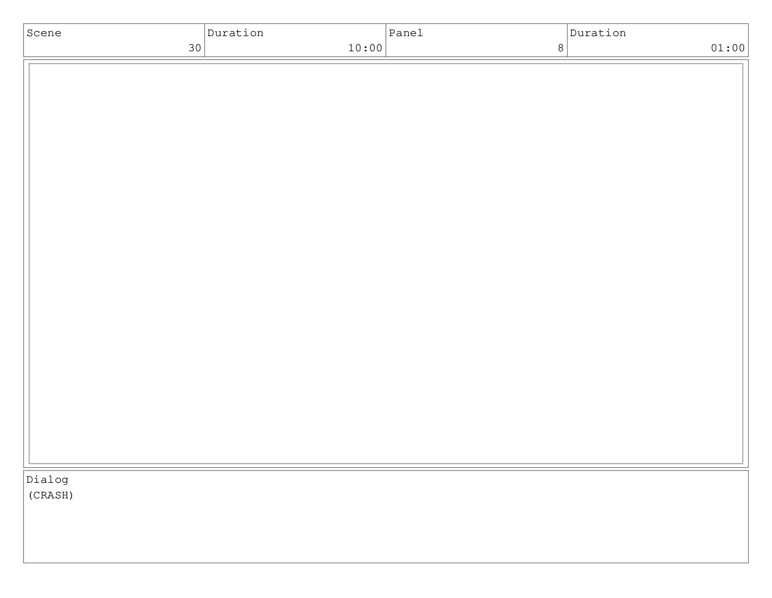 Scene 30 Duration 10:00 Panel 8 Duration 01:00 Dialog (CRASH)