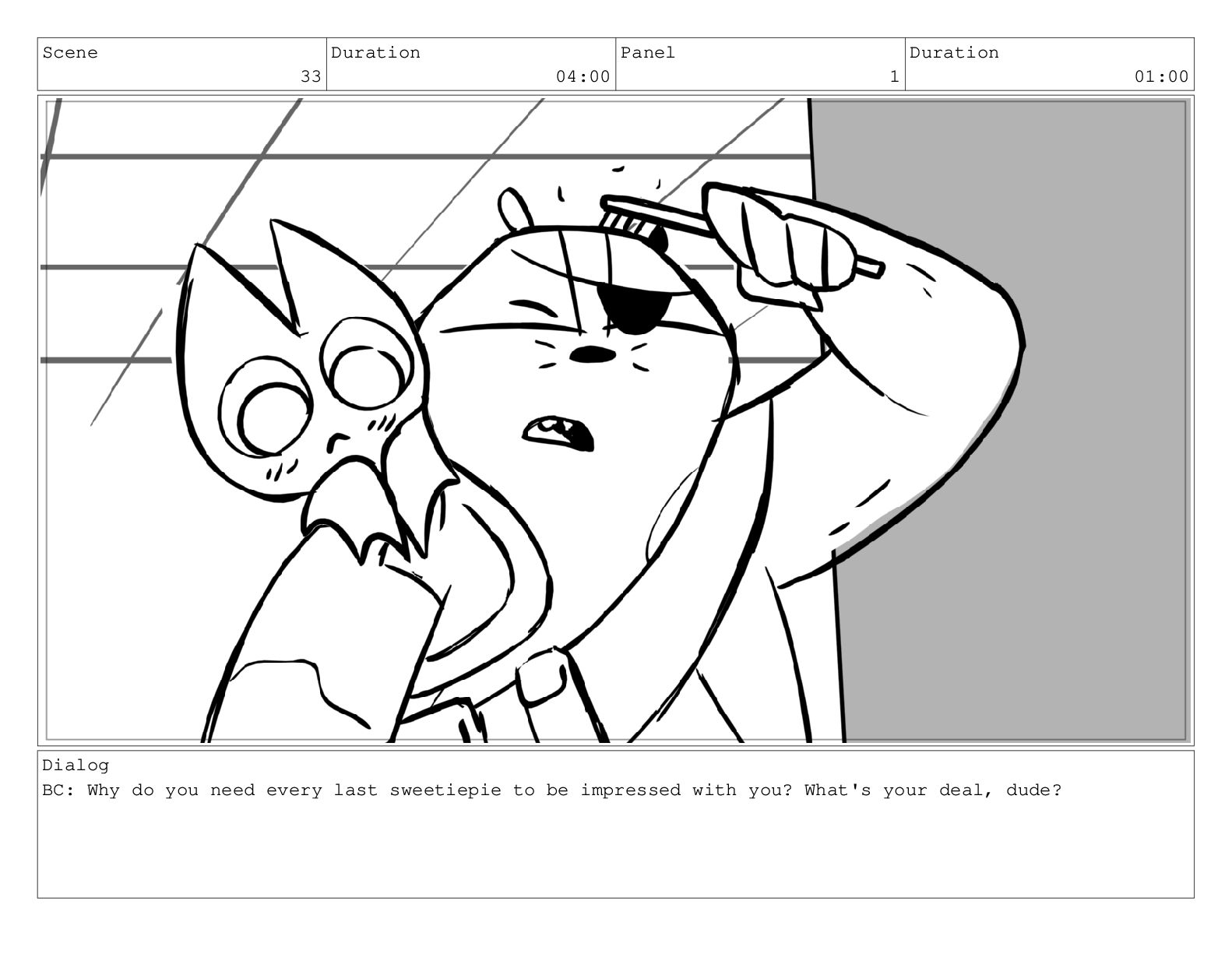 Scene 33 Duration 04:00 Panel 1 Duration 01:00 Dialog BC: