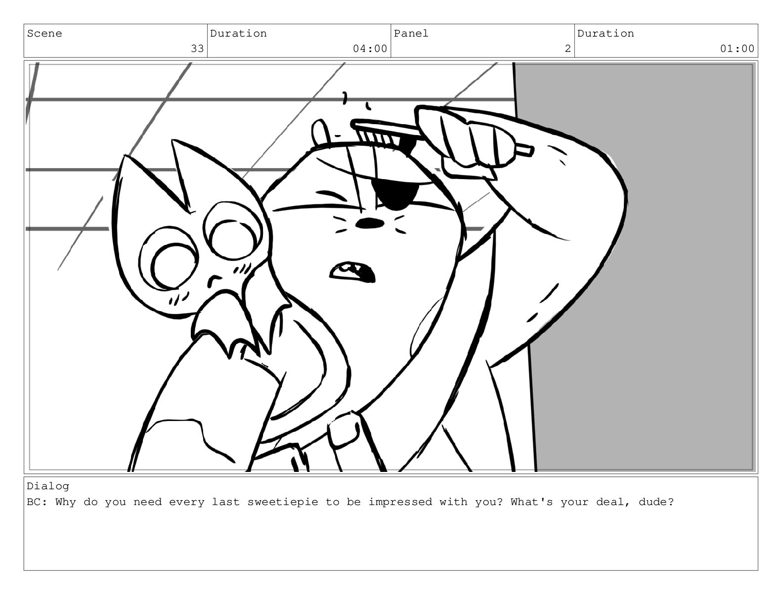 Scene 33 Duration 04:00 Panel 2 Duration 01:00 Dialog BC: