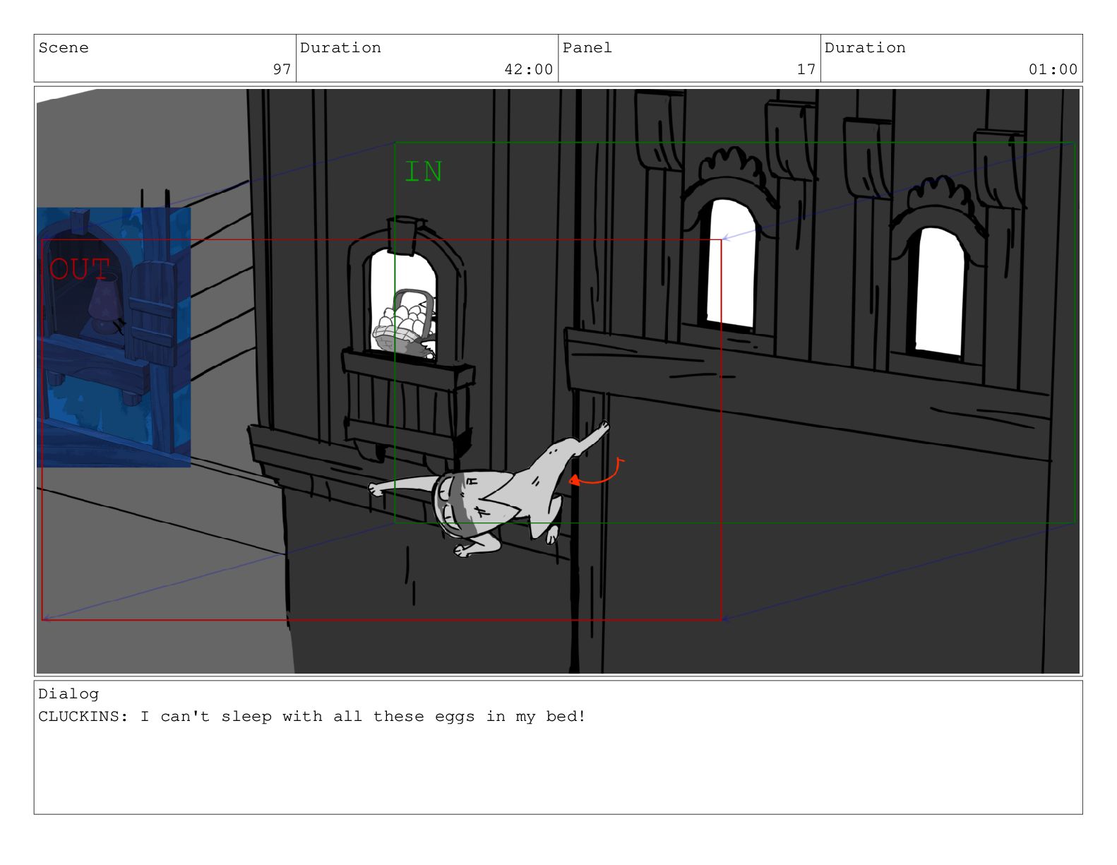 Scene 97 Duration 42:00 Panel 17 Duration 01:00 Dialog CLUCKINS: