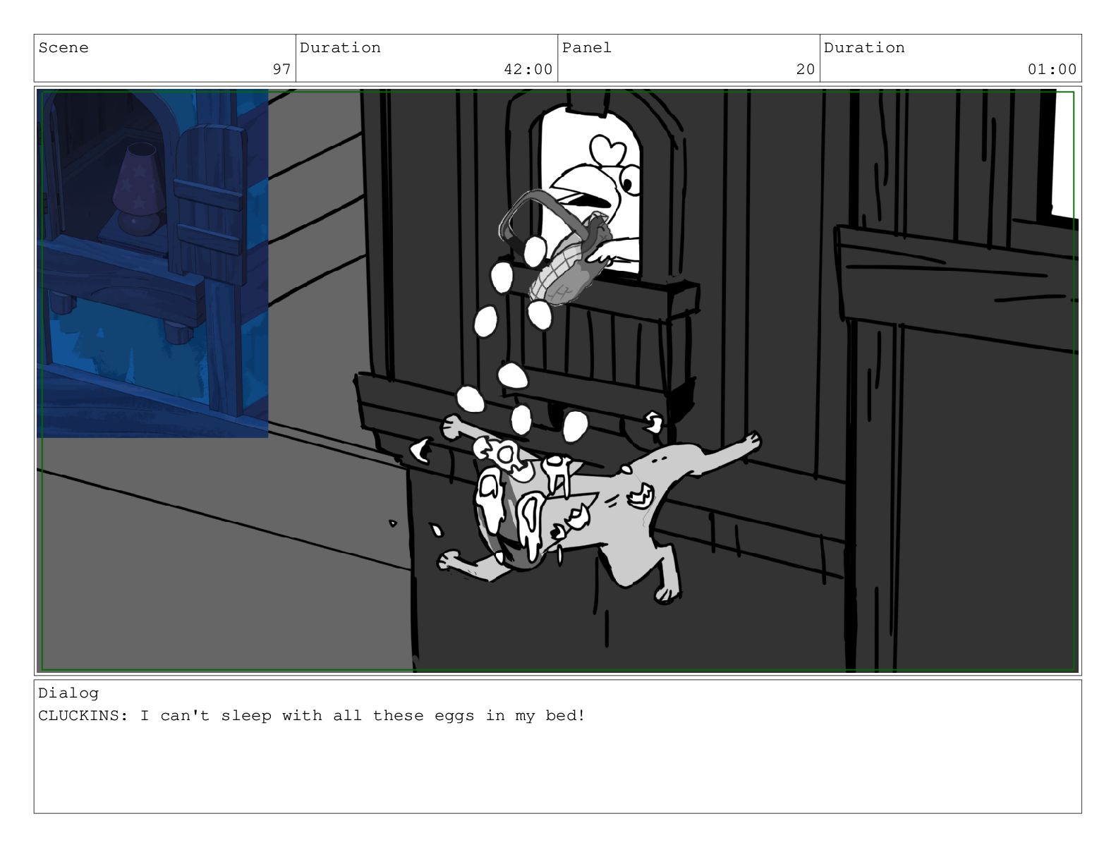 Scene 97 Duration 42:00 Panel 20 Duration 01:00 Dialog CLUCKINS: