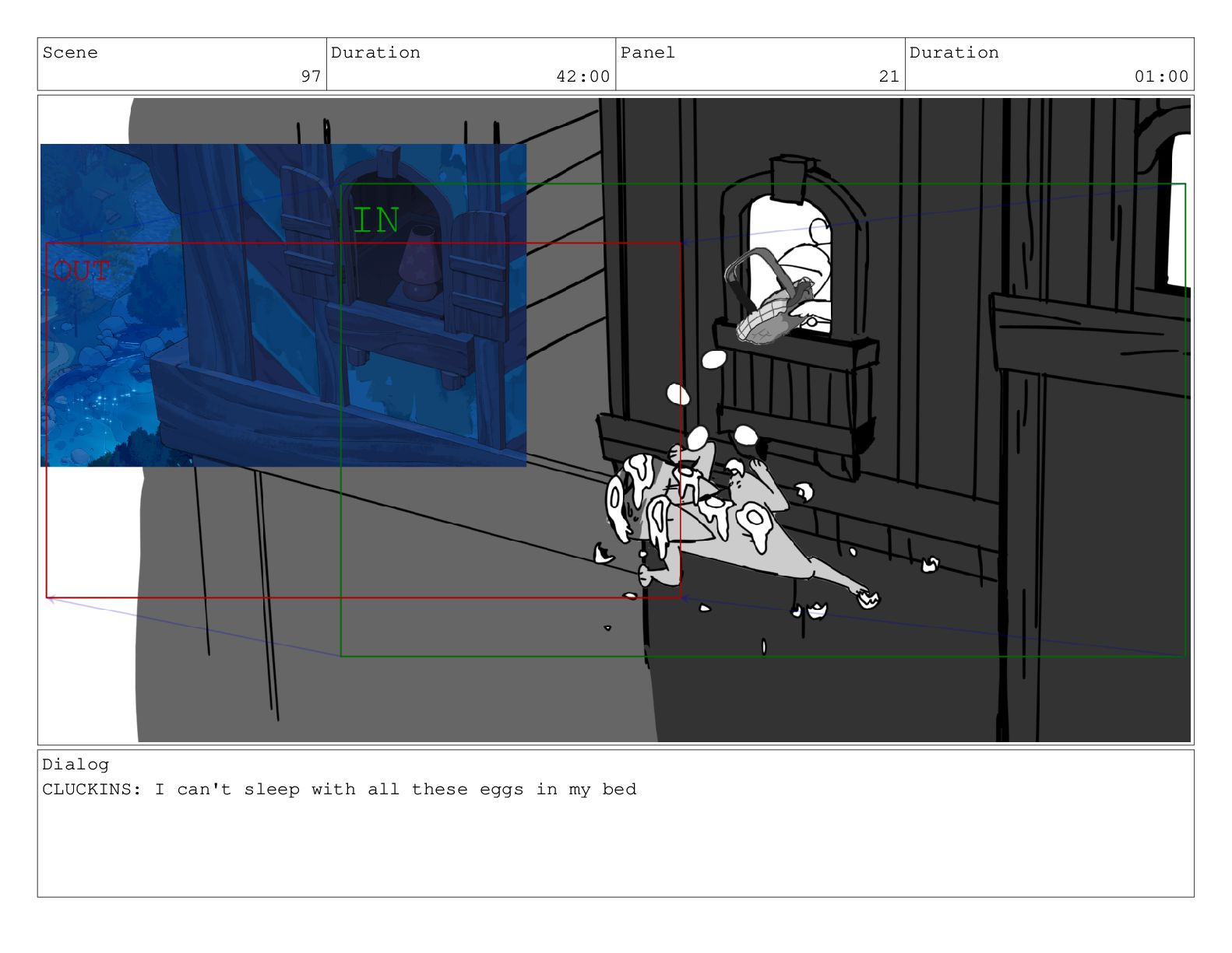 Scene 97 Duration 42:00 Panel 21 Duration 01:00 Dialog CLUCKINS: