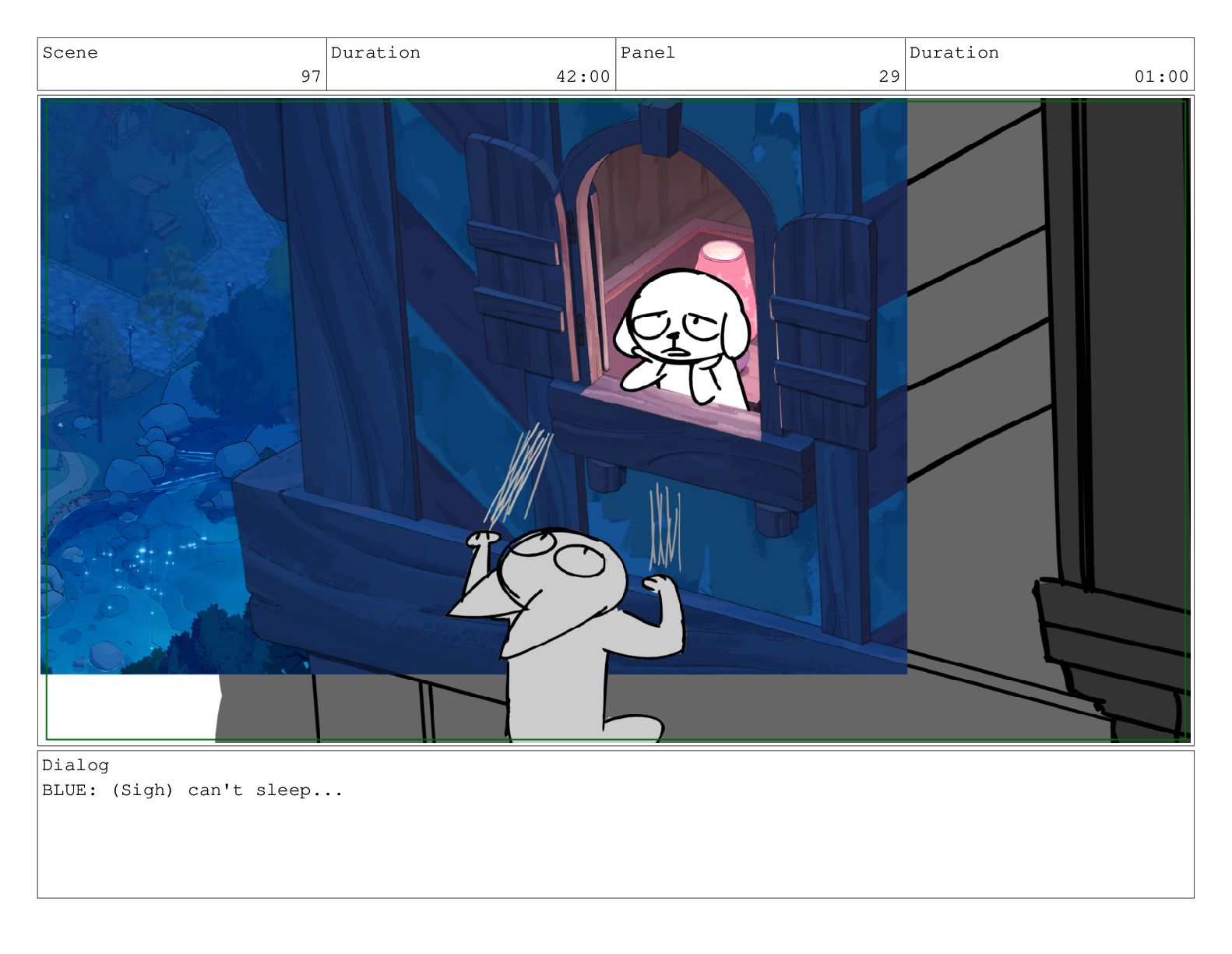 Scene 97 Duration 42:00 Panel 29 Duration 01:00 Dialog BLUE: