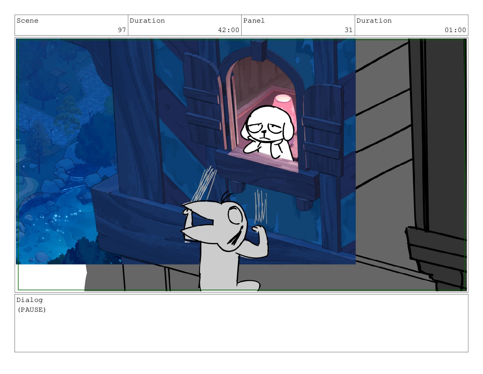 Scene 97 Duration 42:00 Panel 31 Duration 01:00 Dialog (PAUSE)
