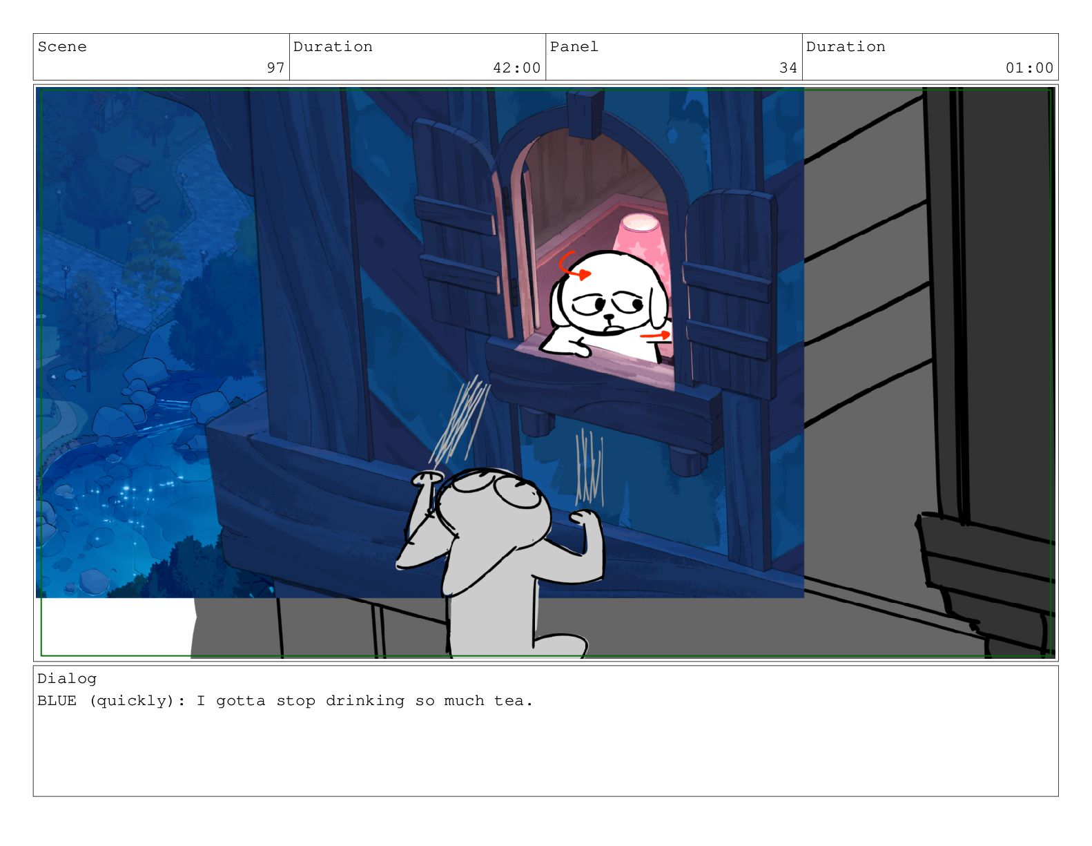 Scene 97 Duration 42:00 Panel 34 Duration 01:00 Dialog BLUE
