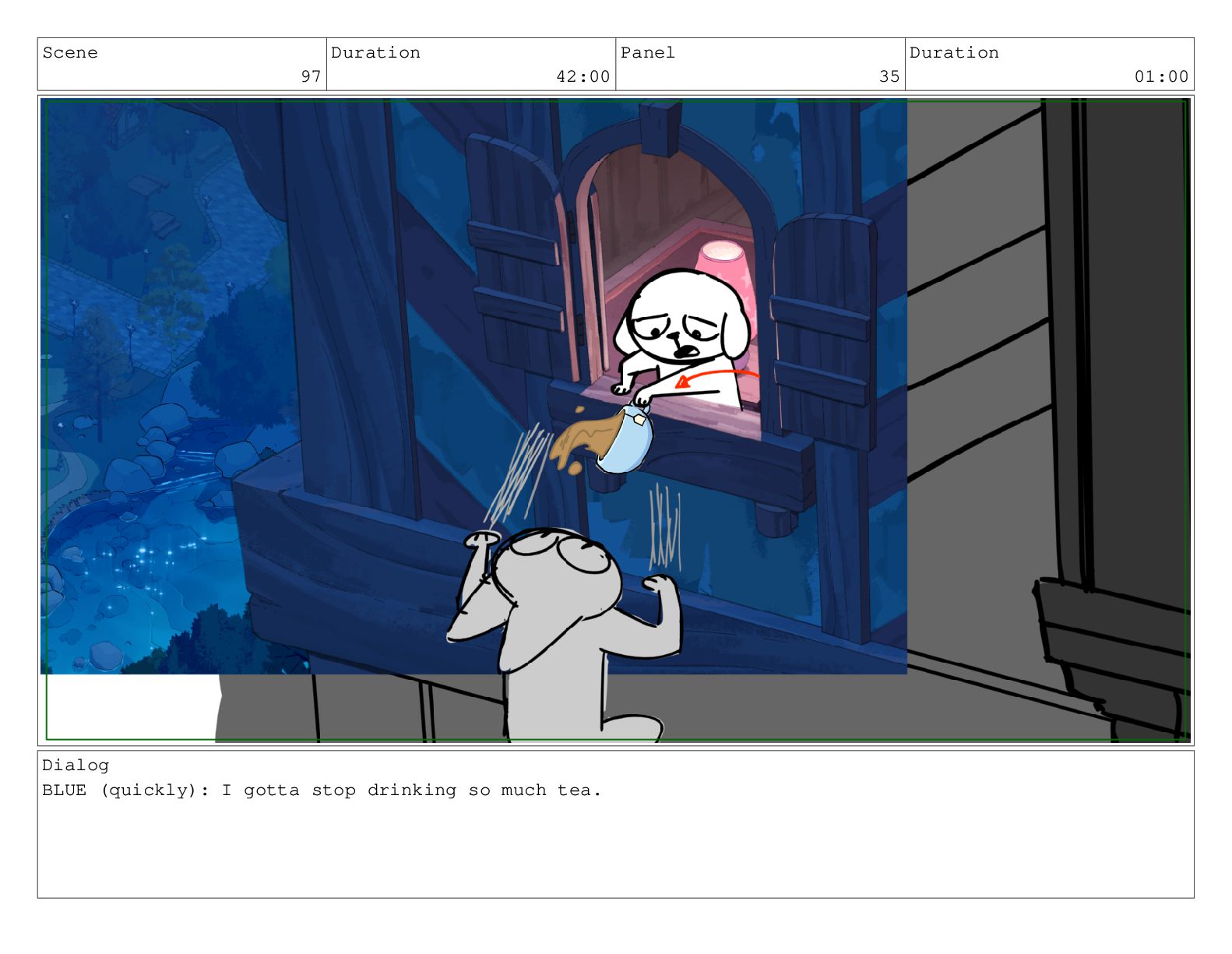 Scene 97 Duration 42:00 Panel 35 Duration 01:00 Dialog BLUE