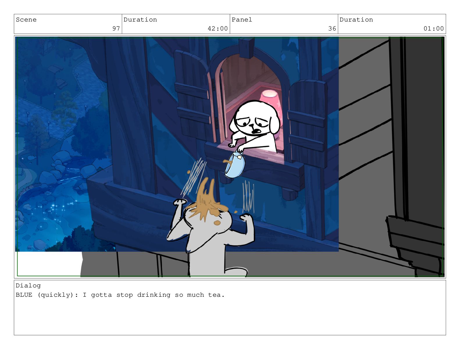 Scene 97 Duration 42:00 Panel 36 Duration 01:00 Dialog BLUE