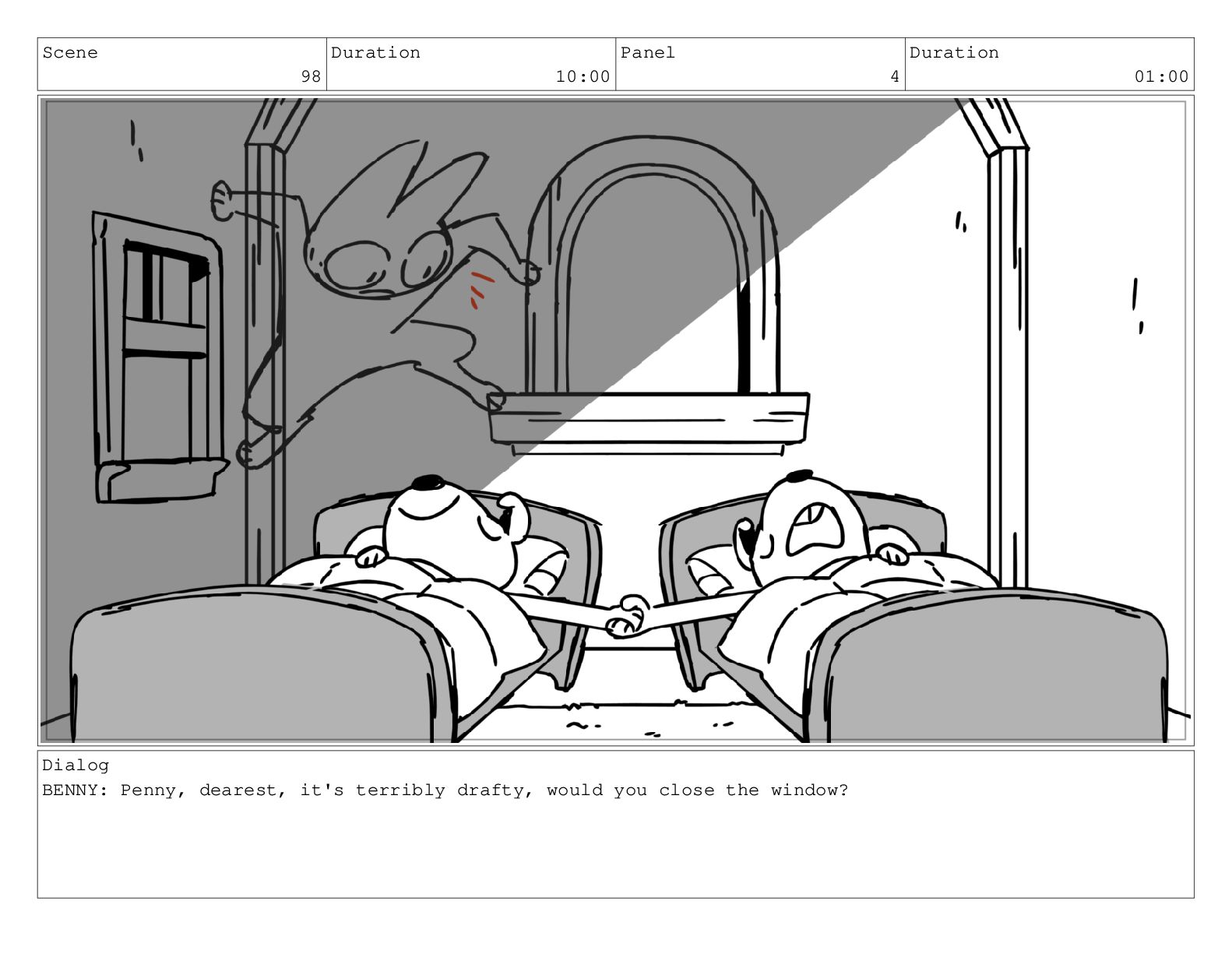 Scene 98 Duration 10:00 Panel 4 Duration 01:00 Dialog BENNY: