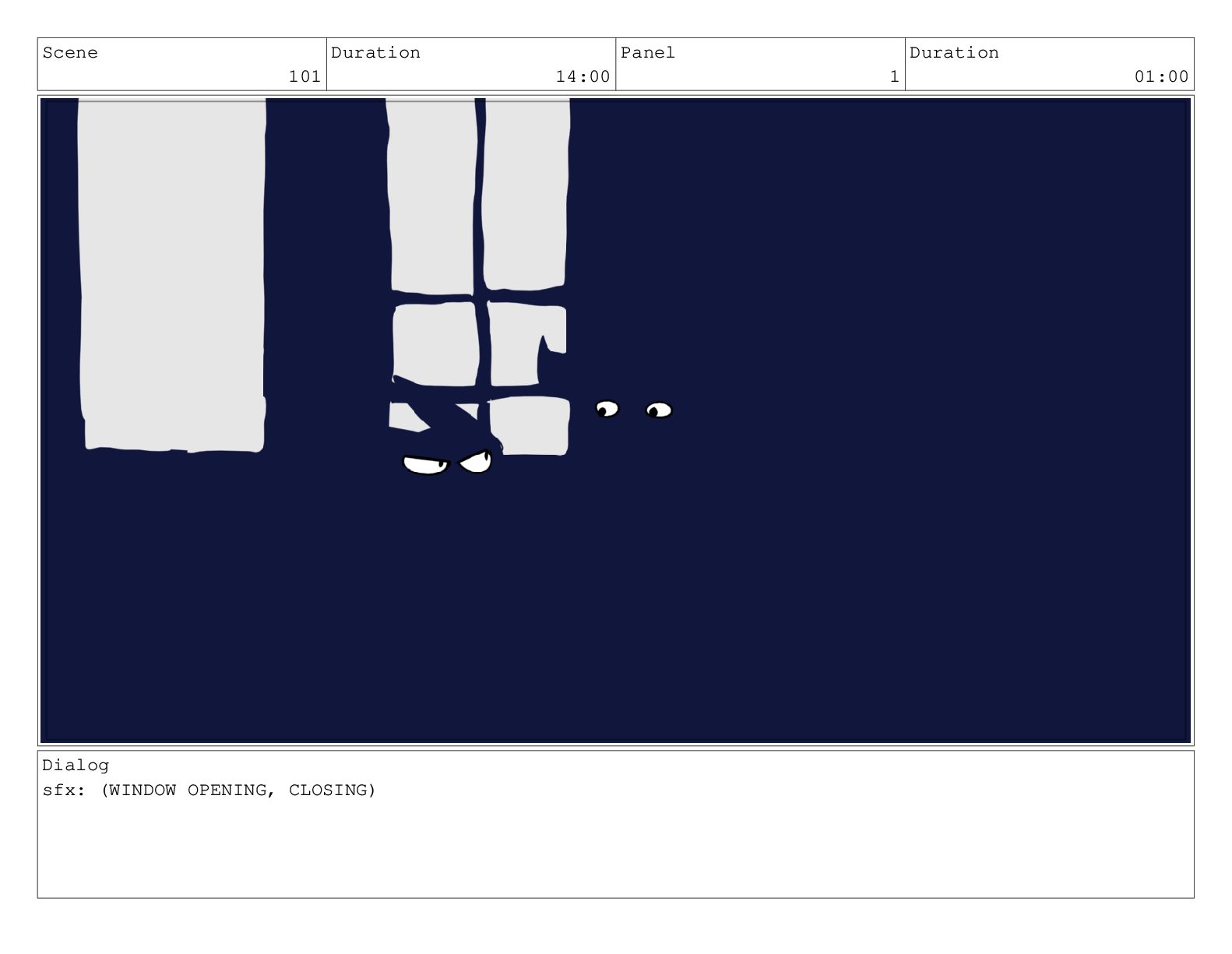 Scene 101 Duration 14:00 Panel 1 Duration 01:00 Dialog sfx: