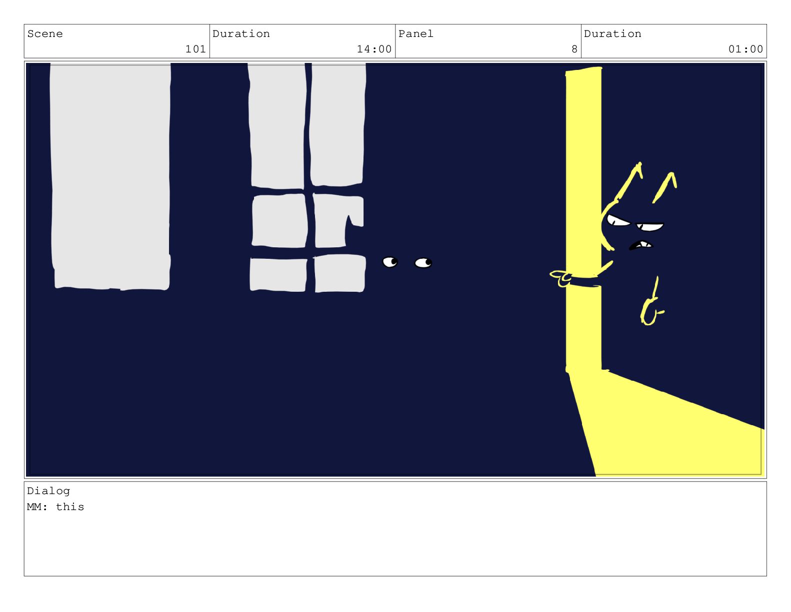 Scene 101 Duration 14:00 Panel 8 Duration 01:00 Dialog MM: