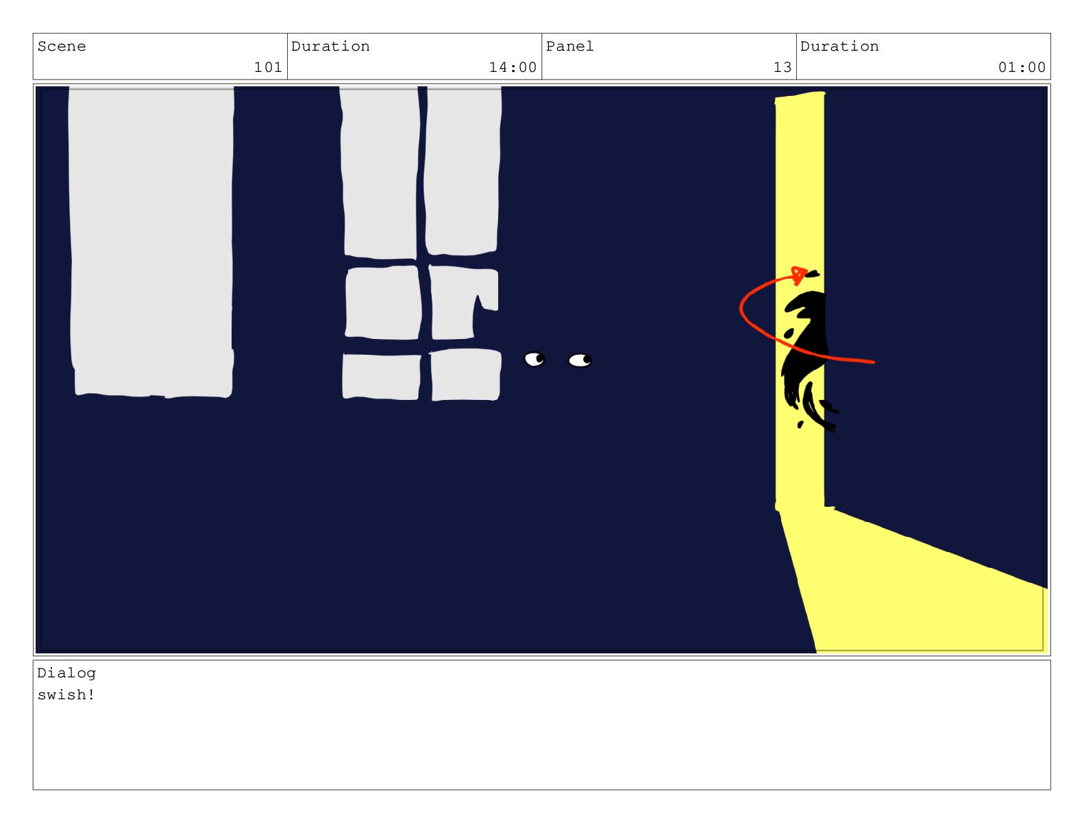 Scene 101 Duration 14:00 Panel 13 Duration 01:00 Dialog swish!