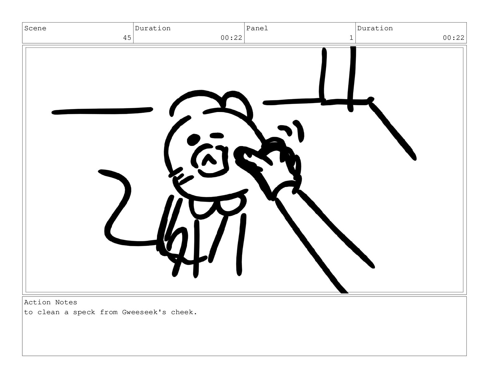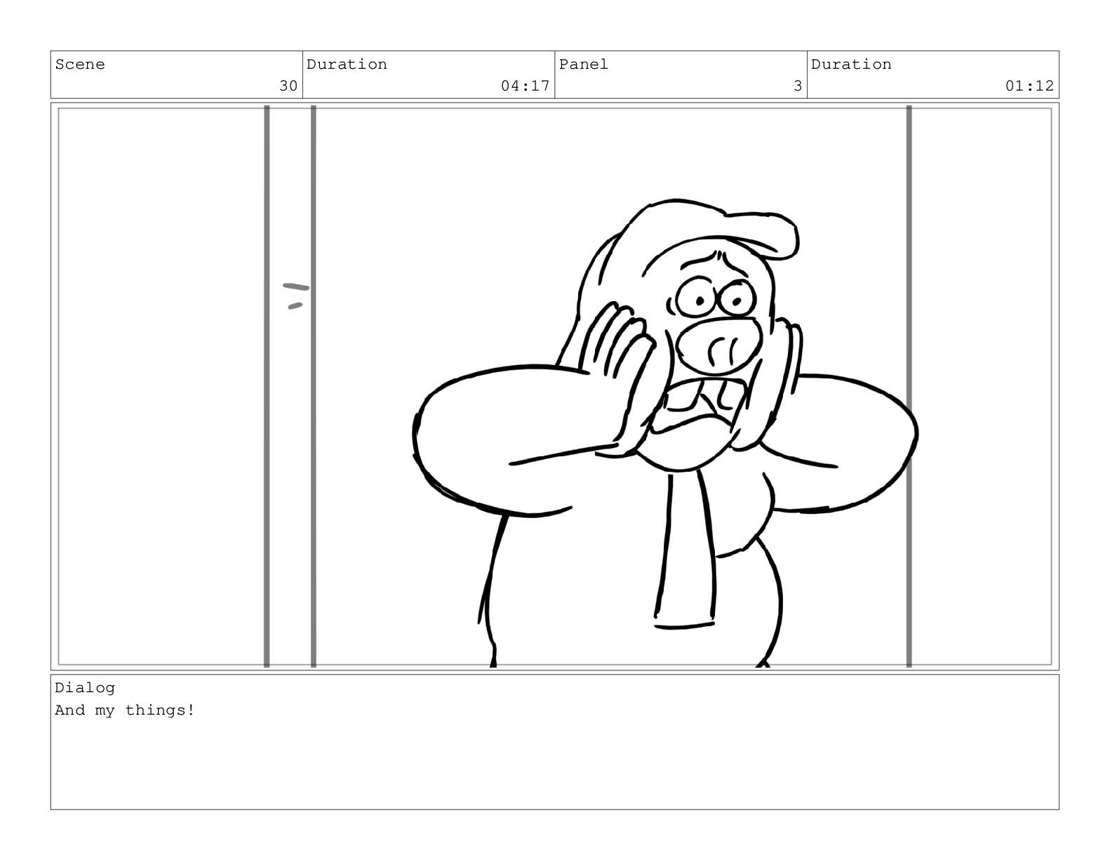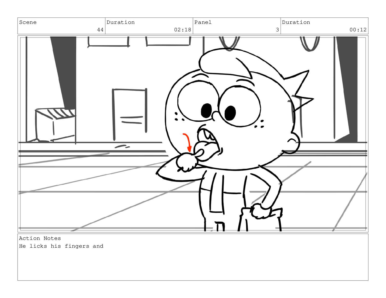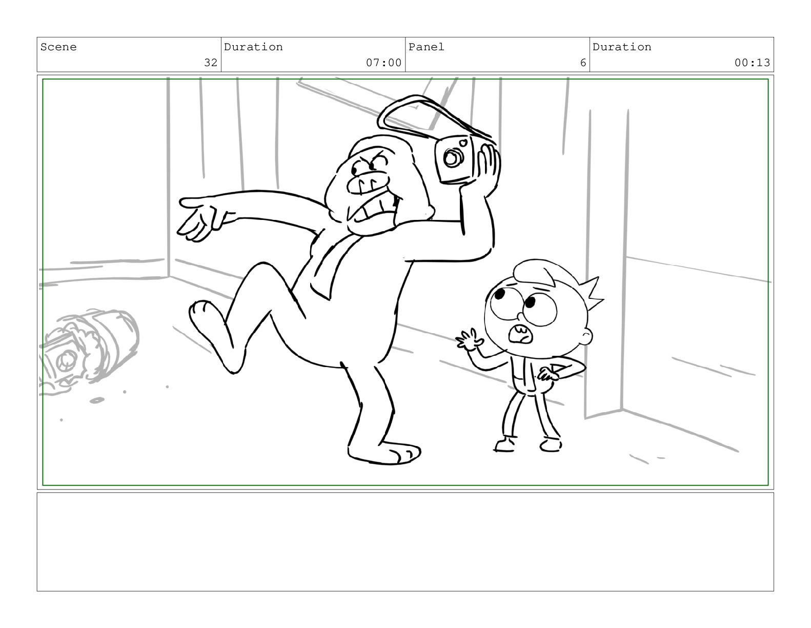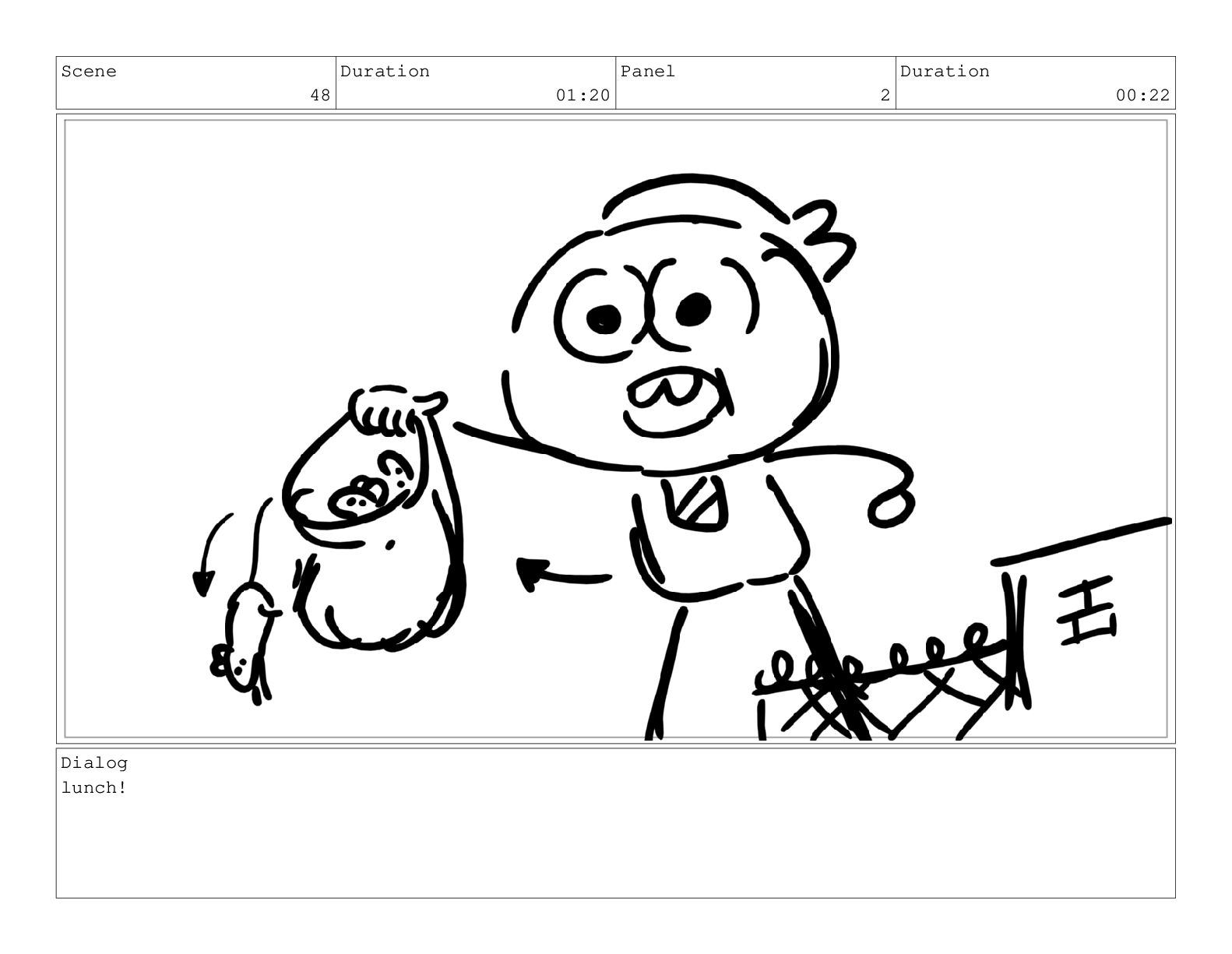 Scene 60 Duration 13:23 Panel 1 Duration 01:11 Action Notes