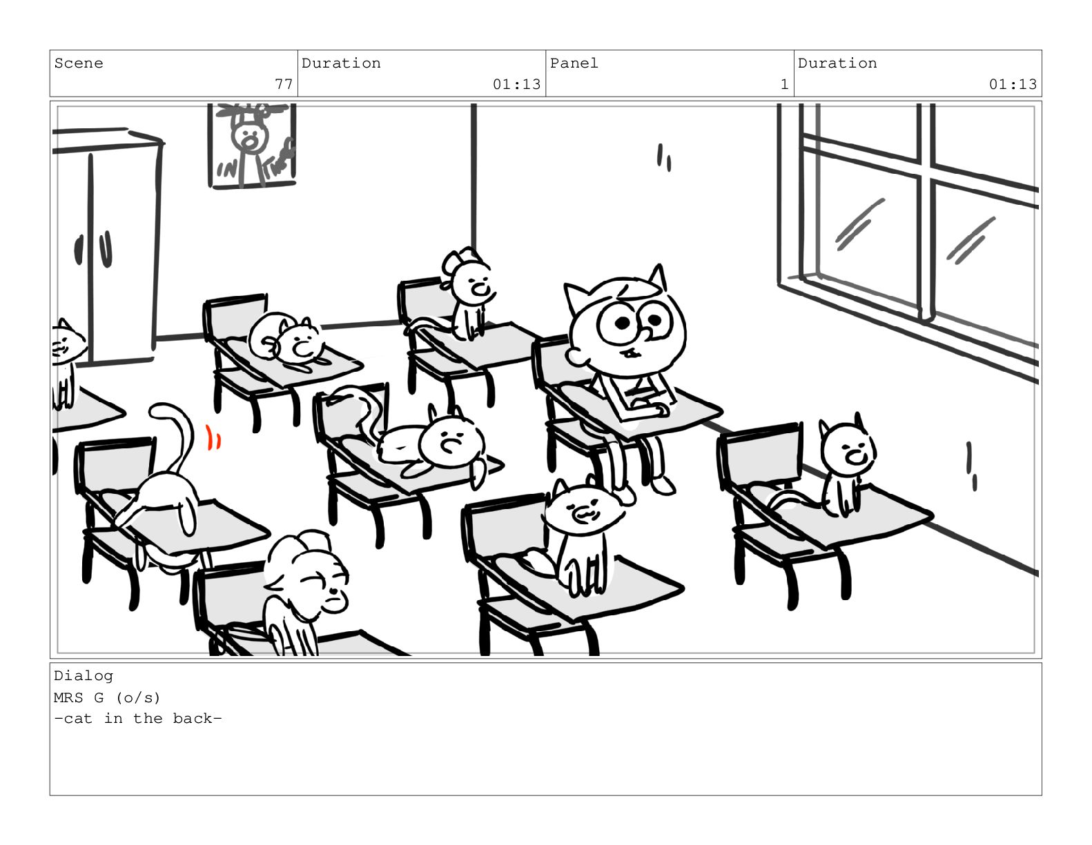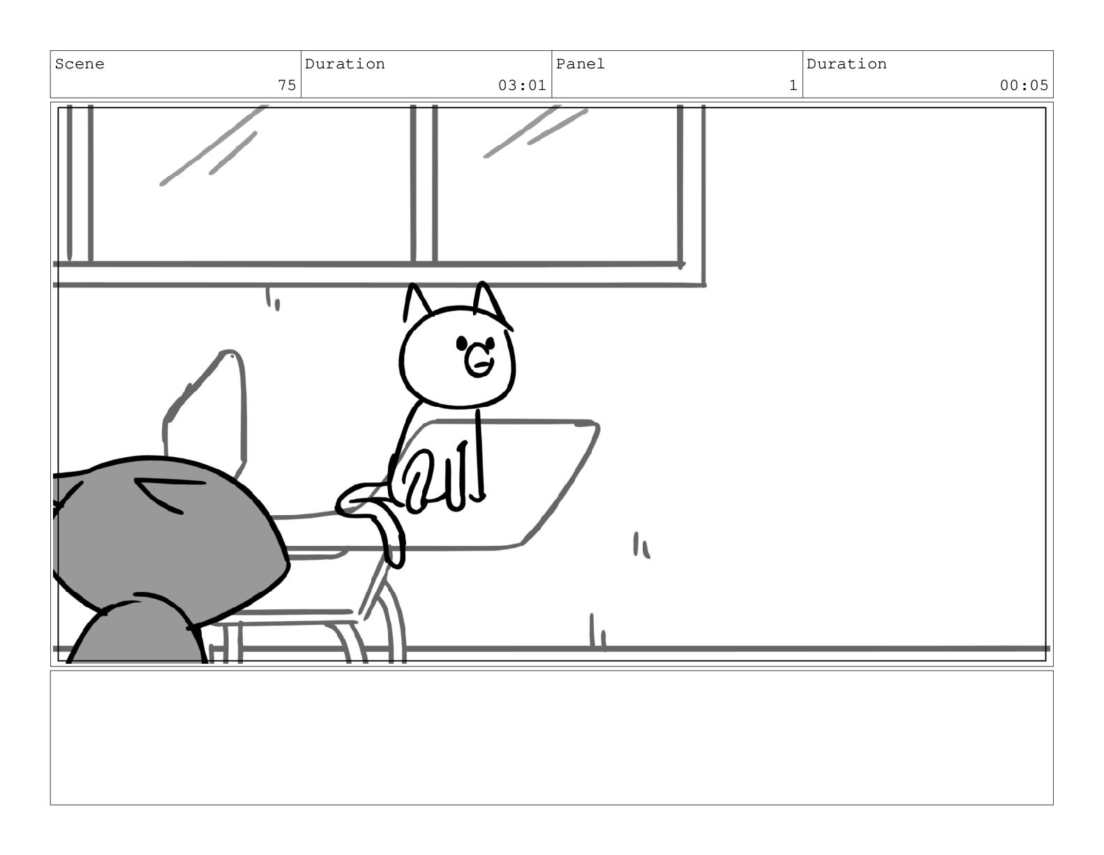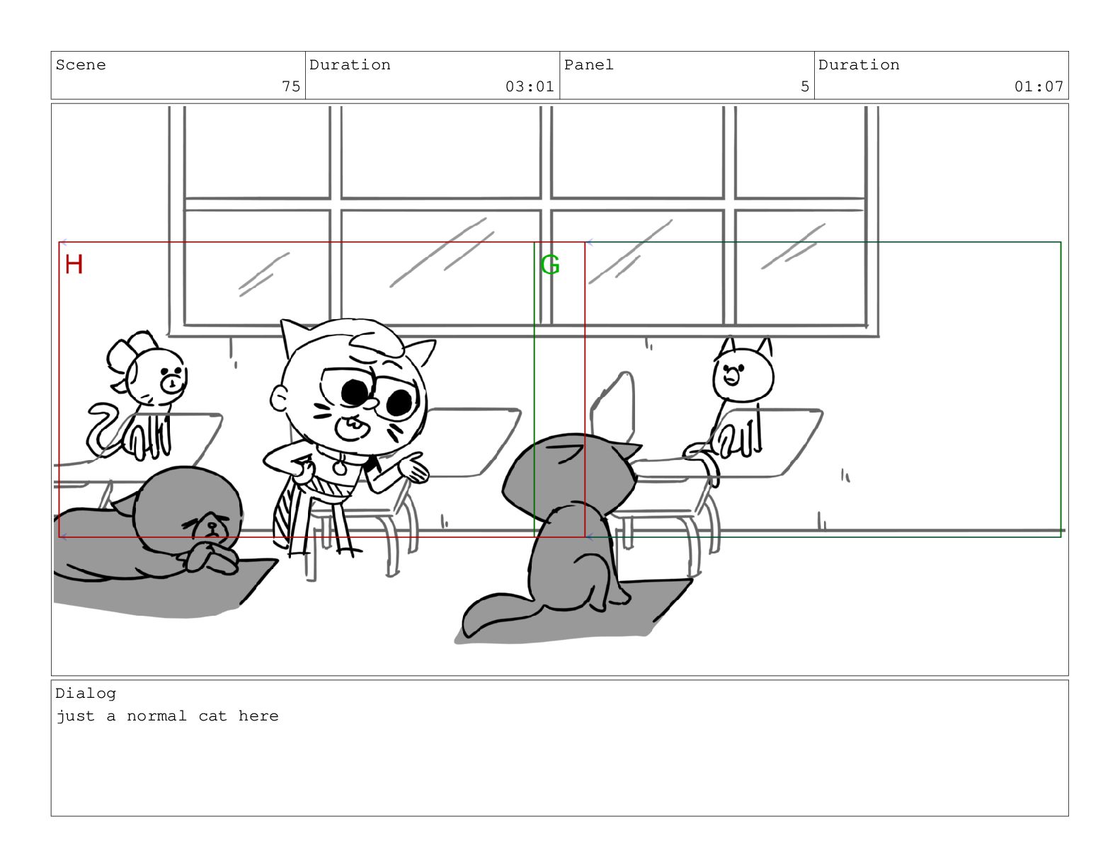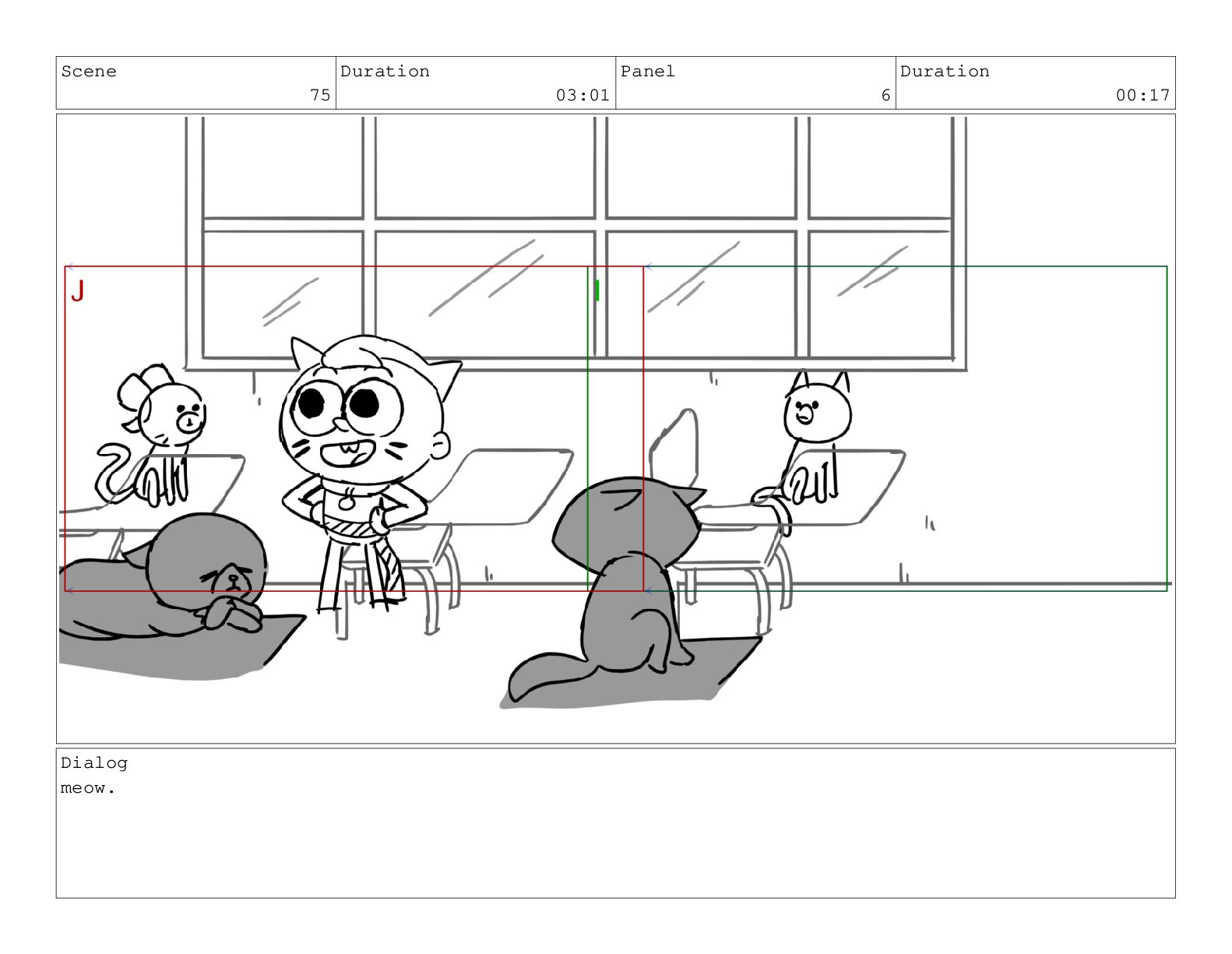 Scene 75 Duration 03:01 Panel 6 Duration 00:17 Dialog meow.