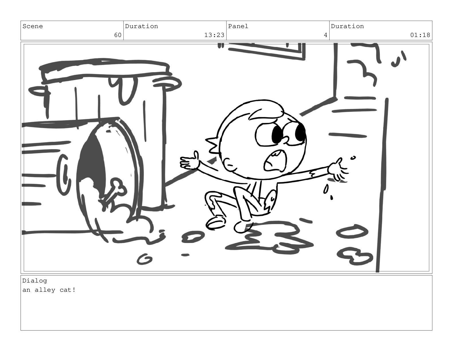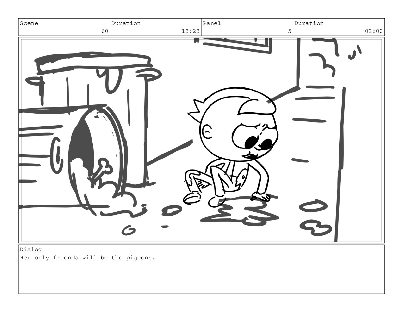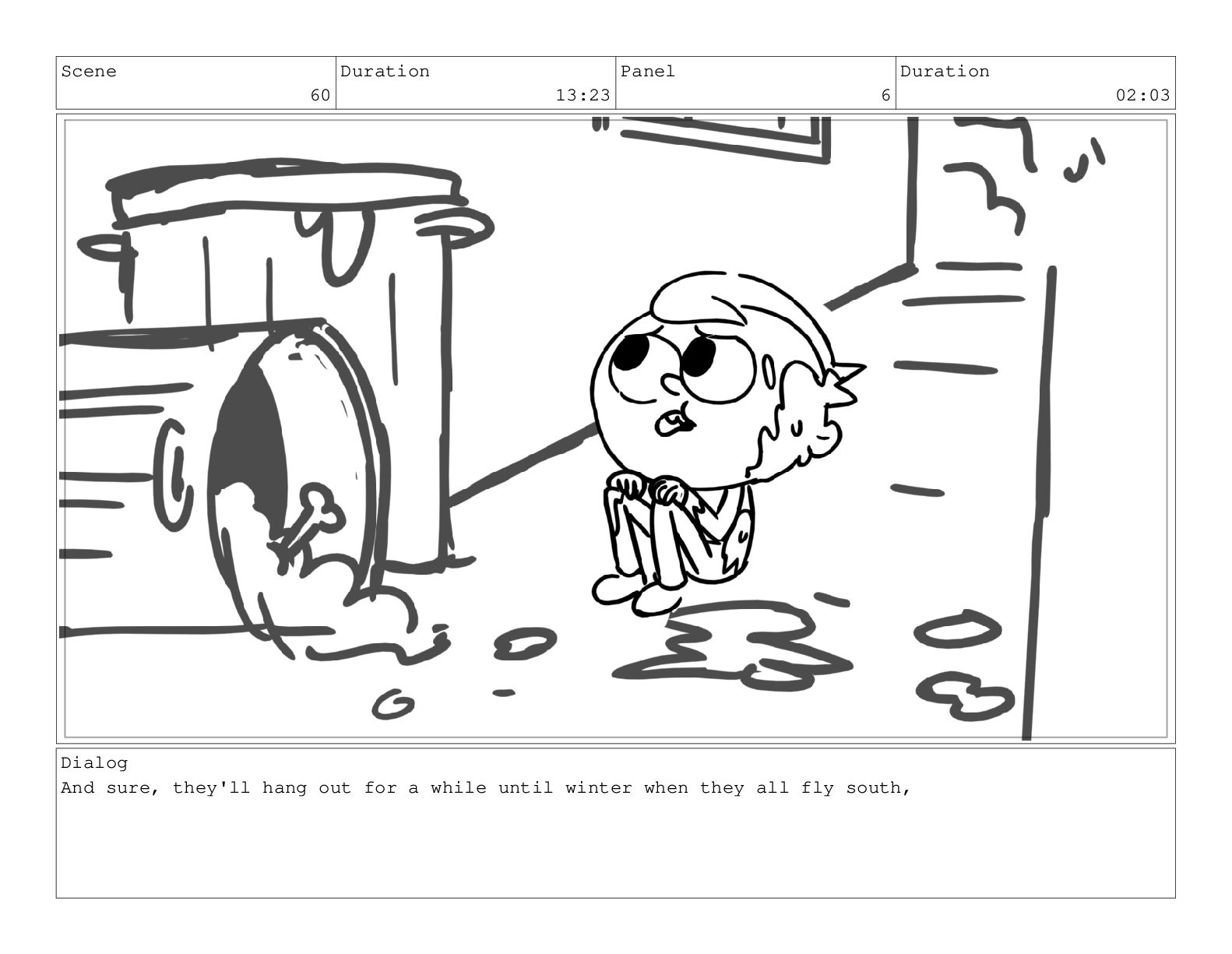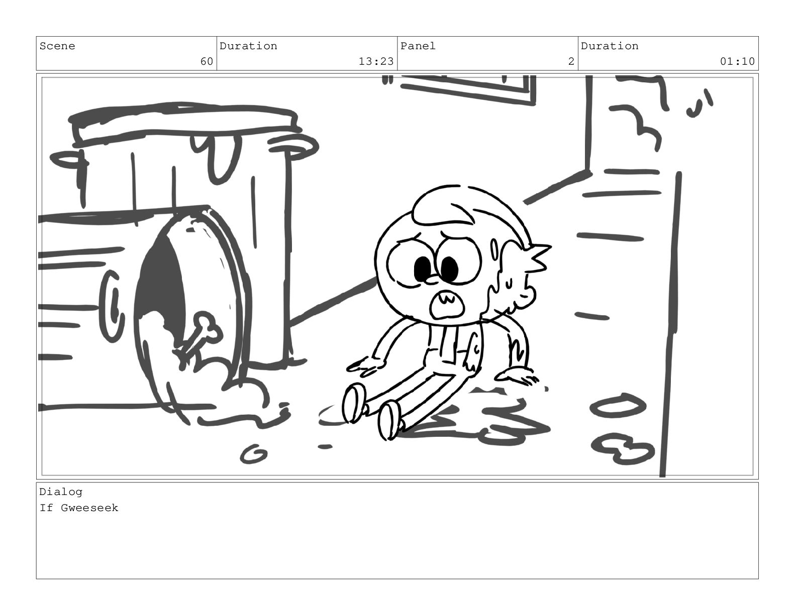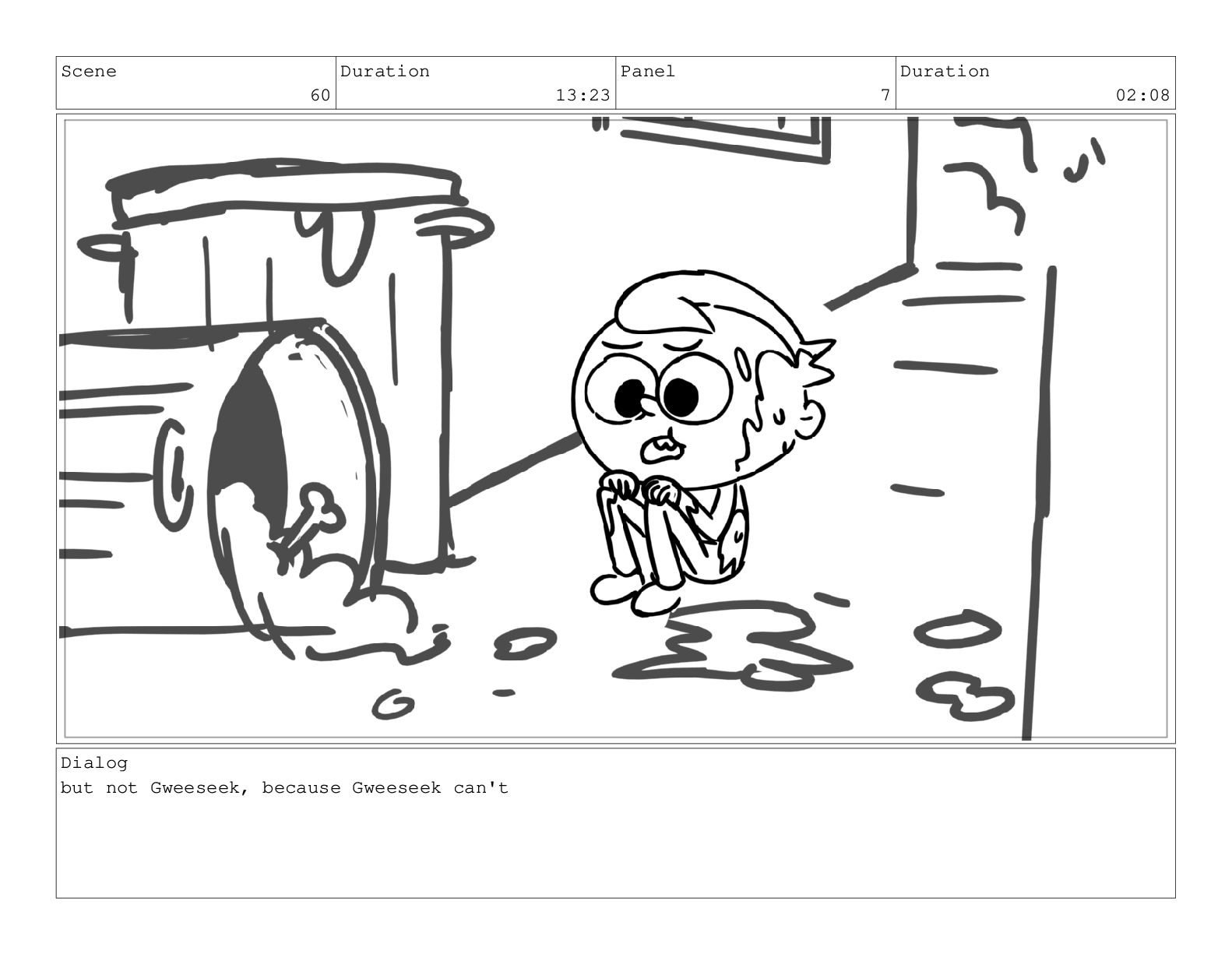 Scene 60 Duration 13:23 Panel 7 Duration 02:08 Dialog but