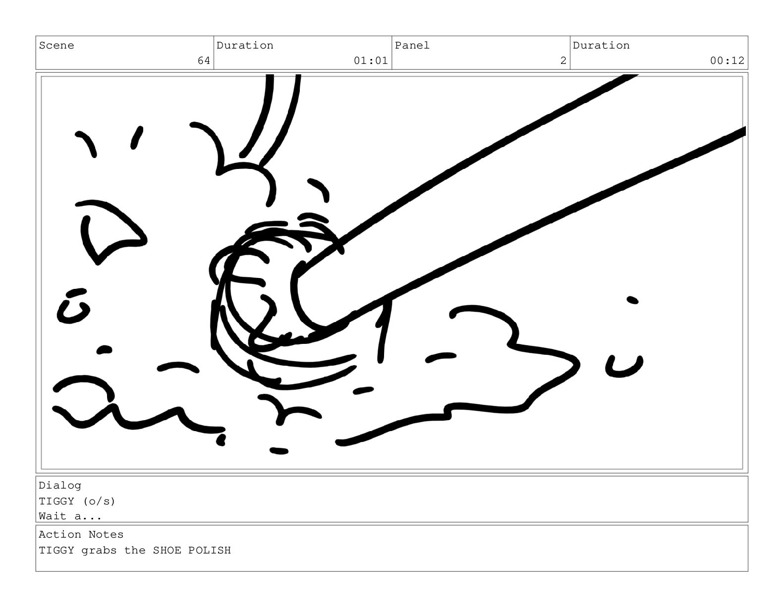 (o/s) Wait a... Action Notes TIGGY grabs the SHOE POLISH