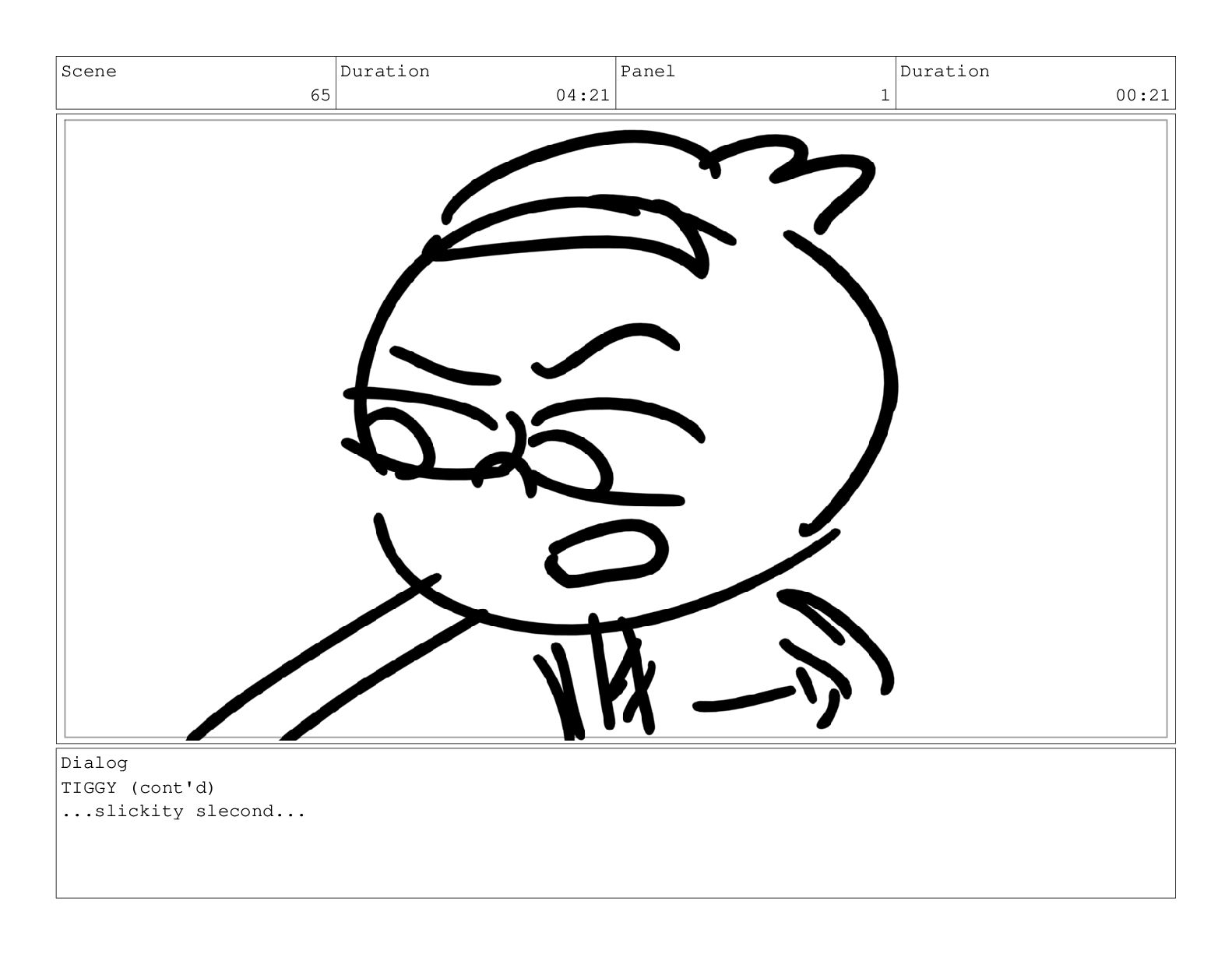 Scene 65 Duration 04:21 Panel 1 Duration 00:21 Dialog TIGGY