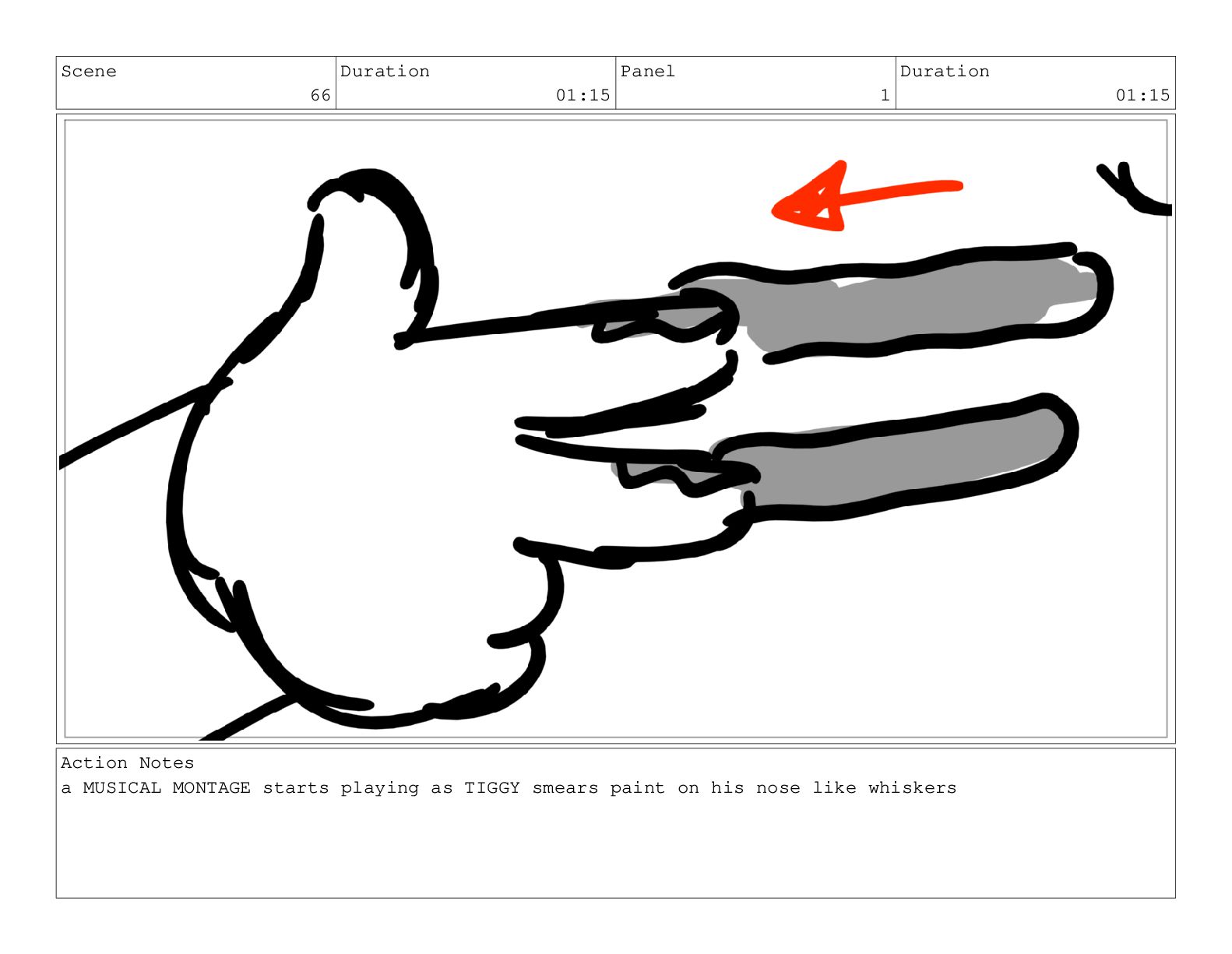 Scene 66 Duration 01:15 Panel 1 Duration 01:15 Action Notes