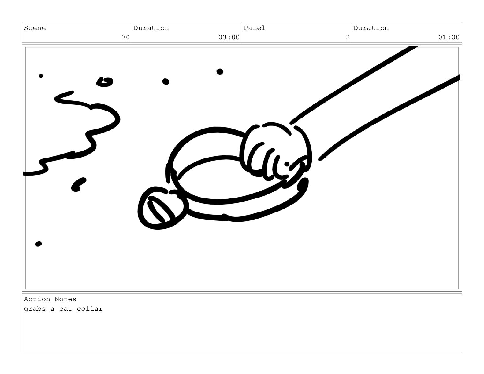 Scene 70 Duration 03:00 Panel 2 Duration 01:00 Action Notes