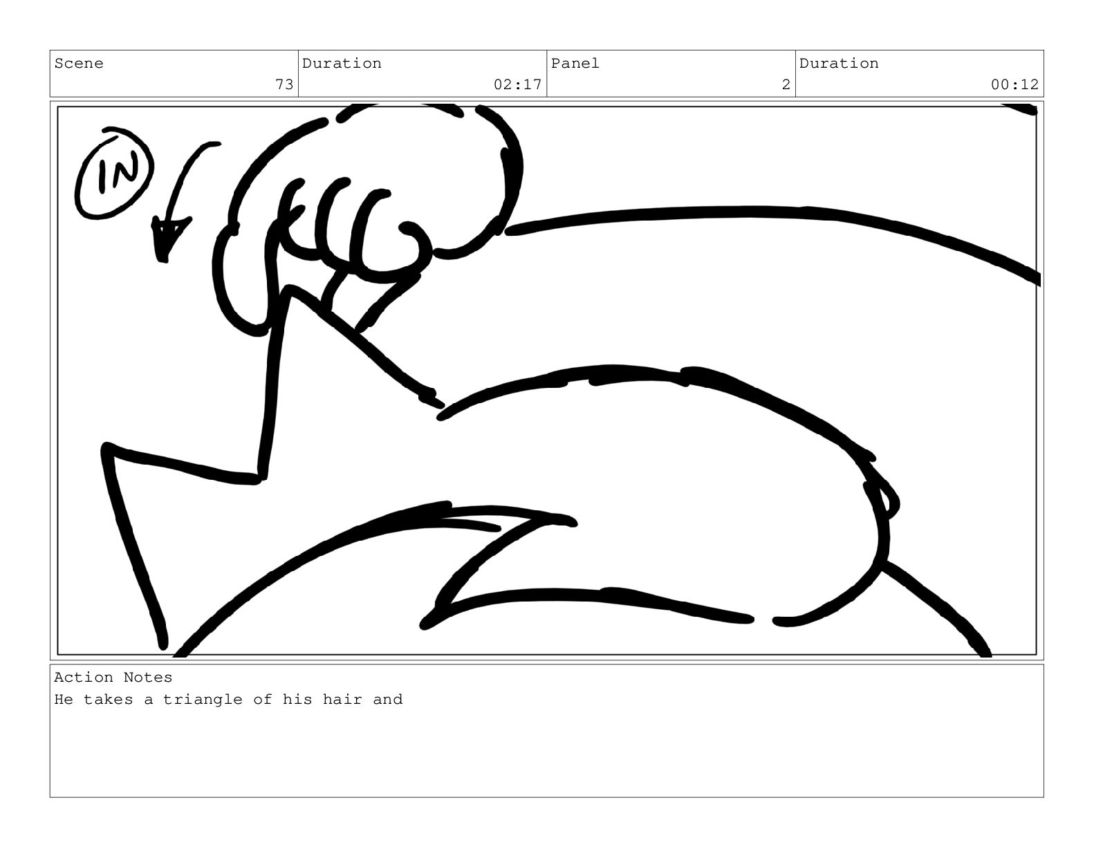Scene 73 Duration 02:17 Panel 2 Duration 00:12 Action Notes